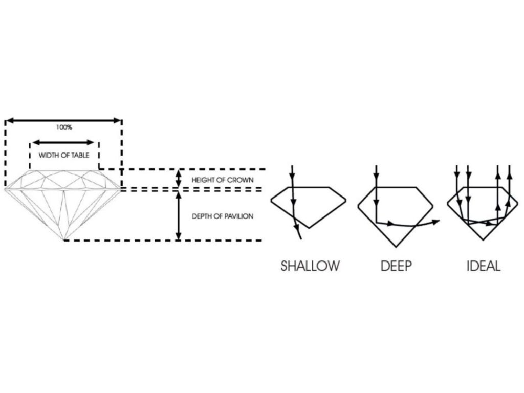 A diamond’s proportions play a significant role in how large it appears. A well-cut stone reflects light beautifully and achieves an ideal surface spread. A stone cut too deep concentrates weight below the surface, making it look smaller. Conversely, a shallow-cut stone may appear wider, but can sacrifice brilliance, beauty and sparkle.