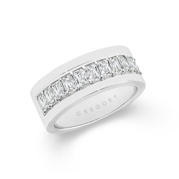 5 - 7 business daysThis sleek and modern wedding band is perfect for those who prefer an understated design. This 18K White Gold Tycoon 8 Men’s Diamond Band features 13 Tycoon 8 cut diamonds shared claw setting on half round tapered band, totalling 2.75ct. Complemented with a high polished finish, making it ideal for everyday wear. Handcrafted in Australia, this ring is made to withstand the years and remain timeless.