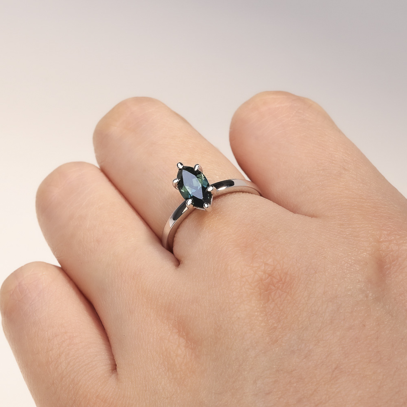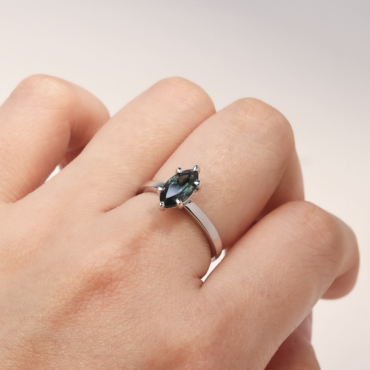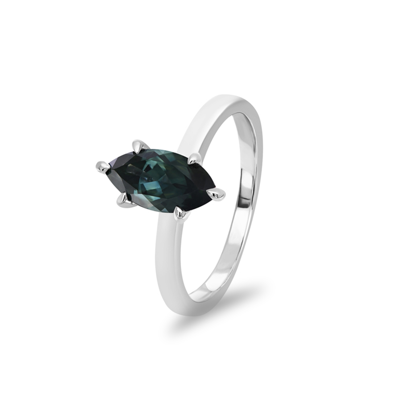 Crafted in 9K white gold, the Maya Ring showcases a stunning marquise-cut blue Australian sapphire in a classic claw setting. Its refined silhouette and timeless design make it a versatile and sophisticated choice for any occasion.