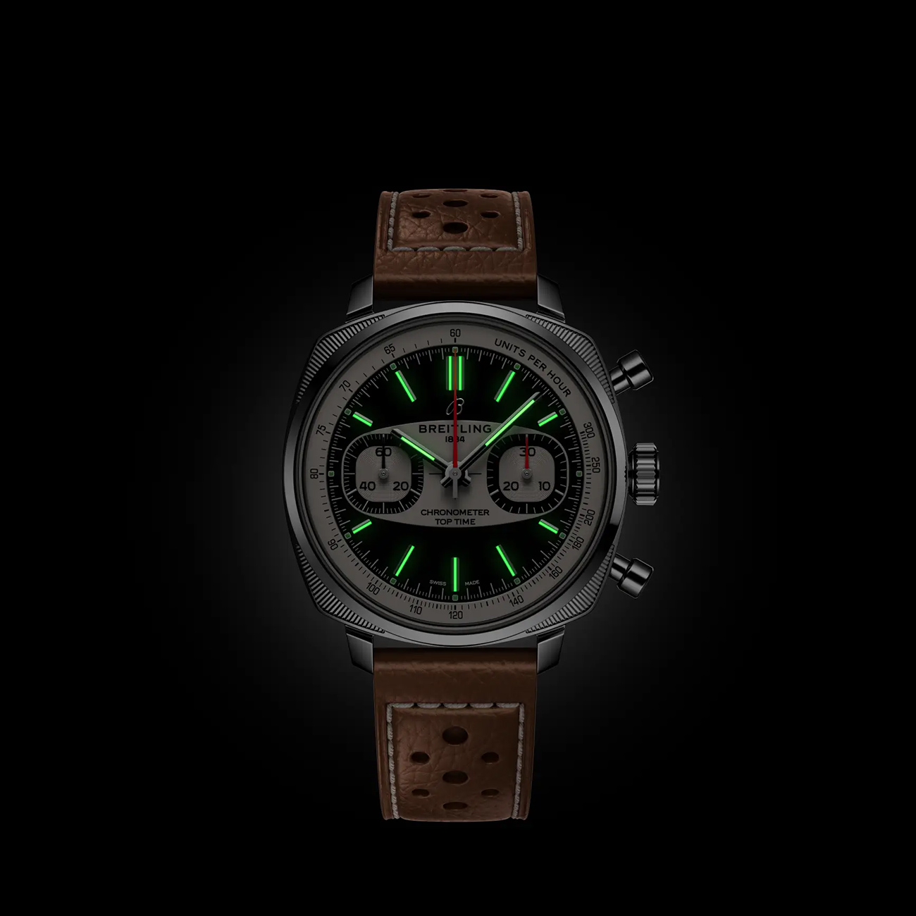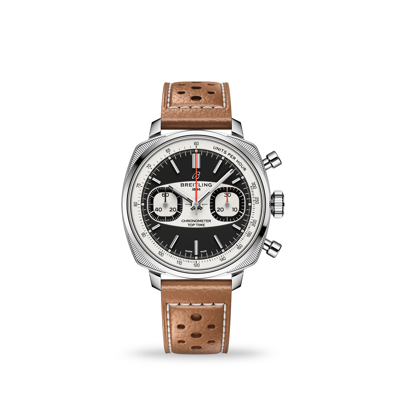 This Breitling Top Time B01 Racing blends vintage motorsport style with modern Swiss chronograph performance. Featuring a distinctive 38 mm stainless-steel cushion case, this racing-inspired timepiece showcases a bold dial with signature “surfboard” motif and tachymeter scale. Powered by the in-house Breitling Manufacture Calibre 01 automatic chronograph, it delivers a reliable 70-hour power reserve. A cambered sapphire crystal and beige calfskin leather strap complete the design, creating a stylish yet sporty watch that celebrates classic 1960s racing heritage.