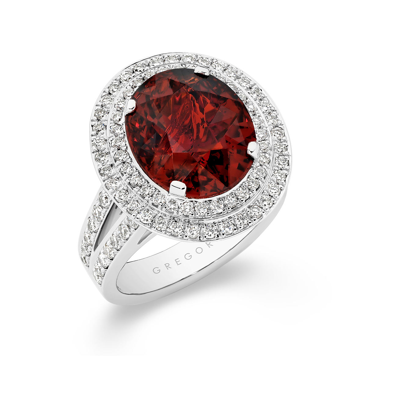 Introducing our dazzling Garnet, Orange Sapphire & Diamond Cocktail Ring from our Cocktail Collection. This exquisite piece is designed to make you shine with unparalleled glamour and sophistication on special occasions. A hand-picked Garnet is surrounded by ninety-six round brilliant diamonds on the double halo and band, and thirty-six round orange sapphires on the gallery, in an elegant claw setting. Expertly crafted in 18K White Gold, this cocktail ring is a mesmerising and breathtaking creation that is sure to captivate all eyes.