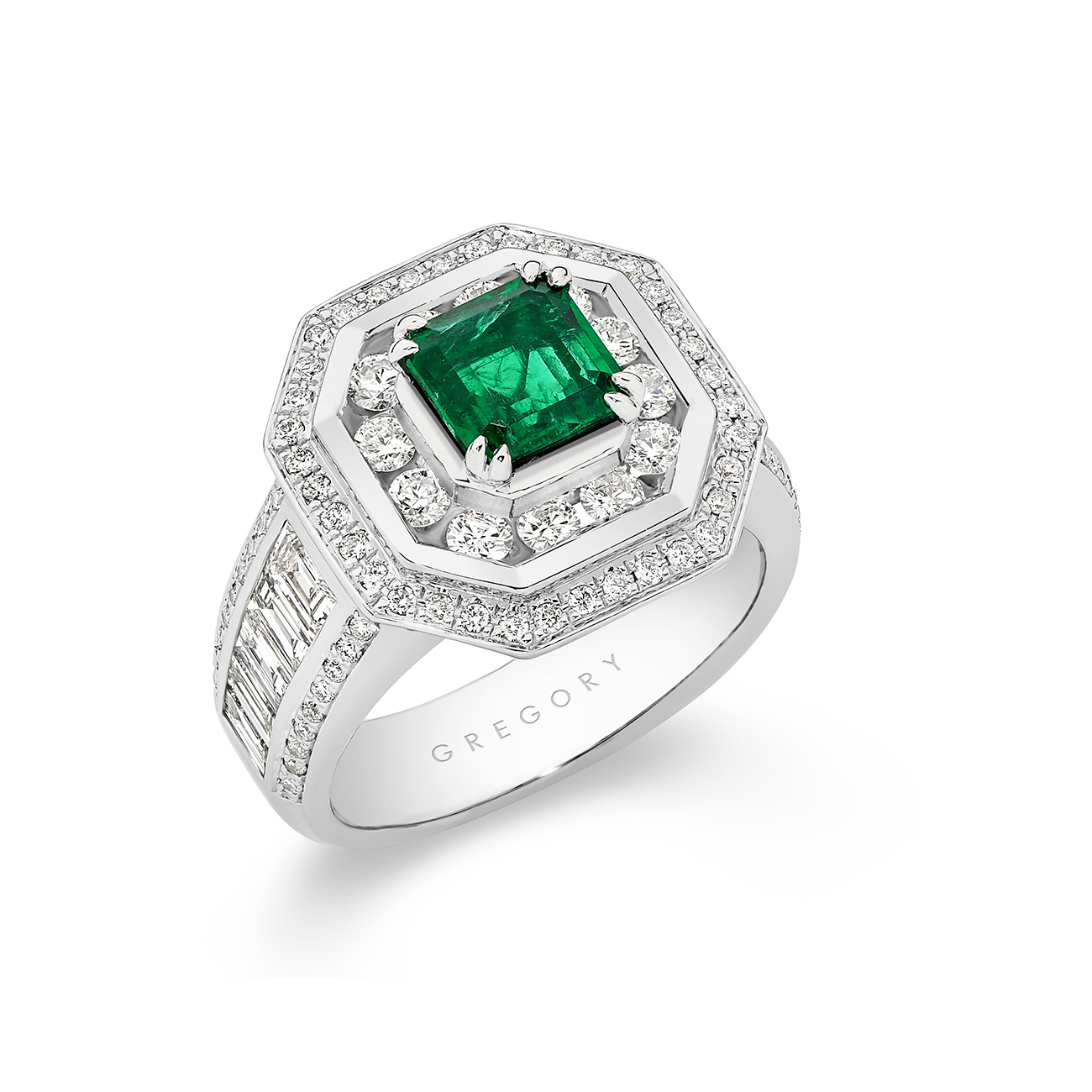 Green Emerald & Diamond Double Halo Cocktail Ring in 18K White & Yellow Gold