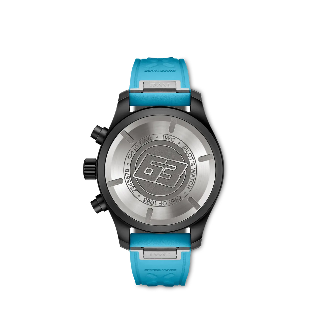 This IWC Pilot’s Watch Chronograph 41 George Russell is a limited-edition luxury timepiece blending motorsport inspiration with aviation precision. Encased in matte black zirconium oxide ceramic with Ceratanium® crown and push-buttons, this 41.9 mm automatic chronograph features a black dial with vivid blue accents and Super-LumiNova®, day/date display and a blue rubber strap with EasX-CHANGE® system. Powered by the in-house calibre 69380 with 46-hour power reserve and 100 meters water resistance, it’s limited to 1,063 pieces.