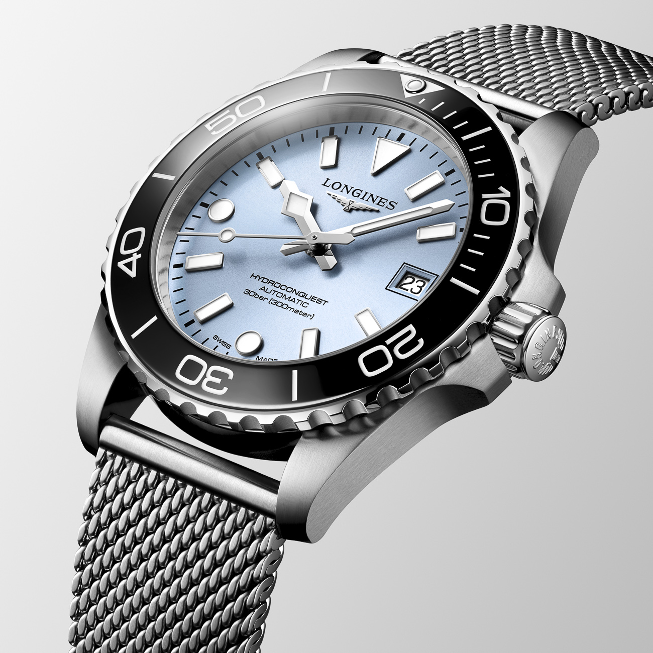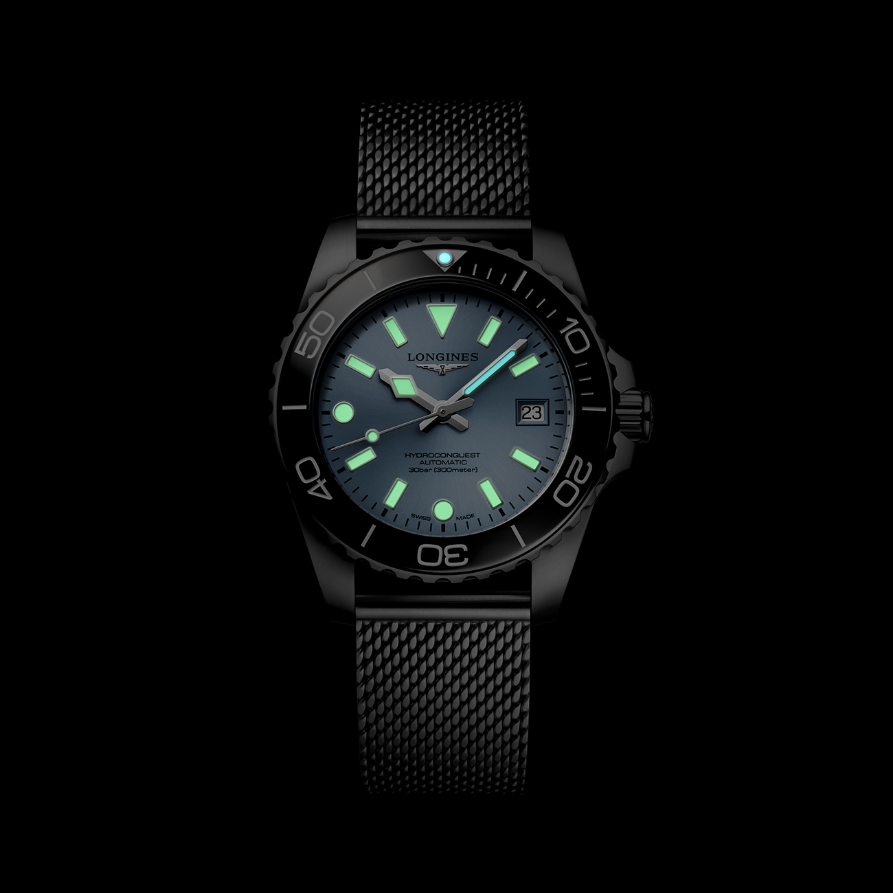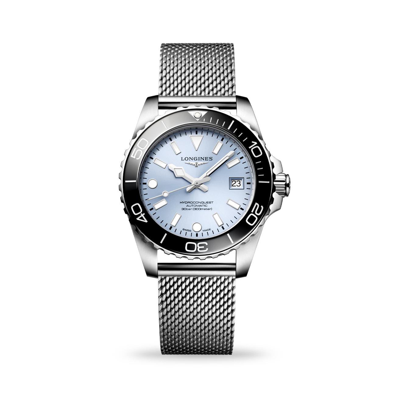 This Longines HydroConquest 39mm delivers a bold yet refined diving aesthetic, featuring a vibrant blue dial and a contrasting black unidirectional rotating ceramic bezel, equipped with a Super-LumiNova®-filled capsule on the triangle at the zero marker for enhanced legibility. The dial is appointed with 11 lacquered, polished, applied rhodium-plated indexes treated with Super-LumiNova®, paired with rhodium-plated and polished hands with matching Super-LumiNova® treatment, ensuring enhanced readability in all conditions. Powered by the reliable calibre L888.5 automatic movement with anti-magnetic technology, it offers excellent performance and resistance to magnetic interference. Finished with a stainless steel case and mesh bracelet, a power reserve of 72 hours, and water resistance up to 300 metres, this Swiss-made timepiece is ideal for both underwater exploration and everyday wear.