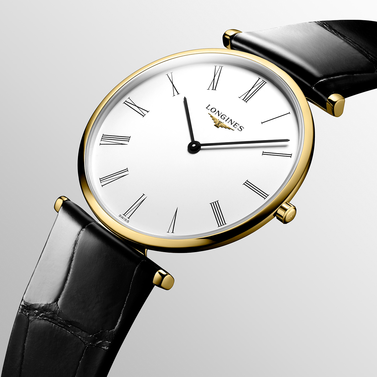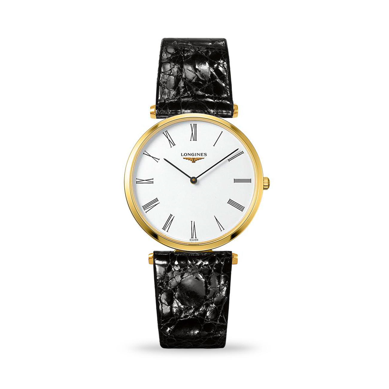 This Longines La Grande Classique de Longines embodies timeless elegance with its ultra-slim 36mm round case and refined white dial. Crafted with a yellow PVD-coated finish and scratch-resistant sapphire crystal, this Swiss-made quartz watch delivers precision and durability. Finished with a black alligator leather strap and classic buckle, it offers understated sophistication for formal or everyday wear. Water-resistant to 30 metres, it reflects Longines’ heritage of minimalist design and enduring style.
