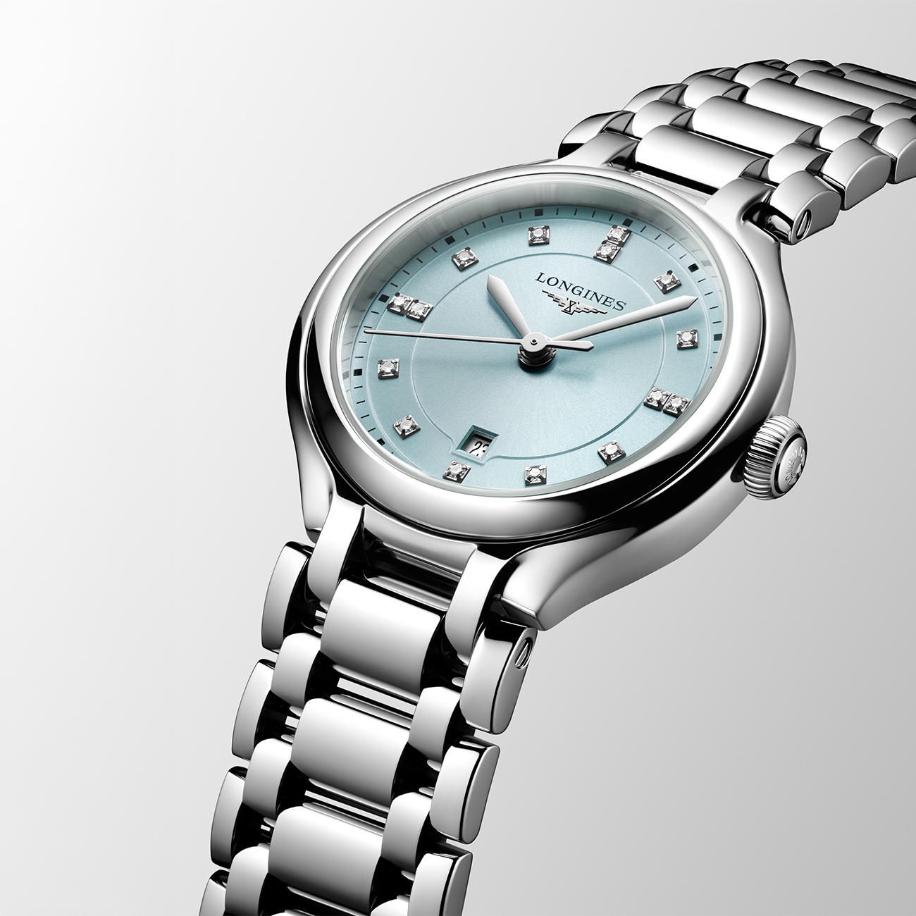 The Longines PrimaLuna L8.142.4.97.6 is a refined 30 mm stainless steel ladies’ watch blending elegance with Swiss precision. Its round case features a scratch-resistant sapphire crystal with multi-layer anti-reflective coating, while the diamond-set dial presents 15 Top Wesselton VS-SI stones and silvered polished hands. Powered by the reliable L257 quartz movement, it offers hours, minutes, seconds, and date functions. A stainless steel bracelet with a triple safety folding clasp adds security and comfort, complementing its feminine, timeless style.