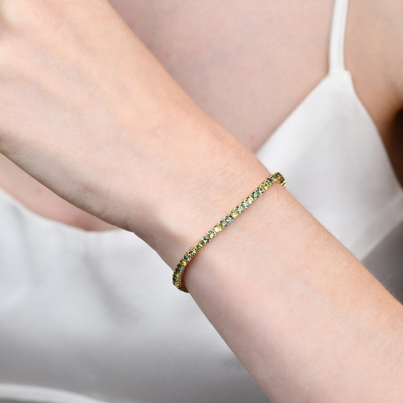 The Nara bracelet showcases an exquisite array of Australian sapphires, hand selected and one-of-a-kind, beautifully set in 9k yellow gold. This piece incorporates the classic tennis bracelet design with unique, beautiful sapphires to create a truly desirable accessory.