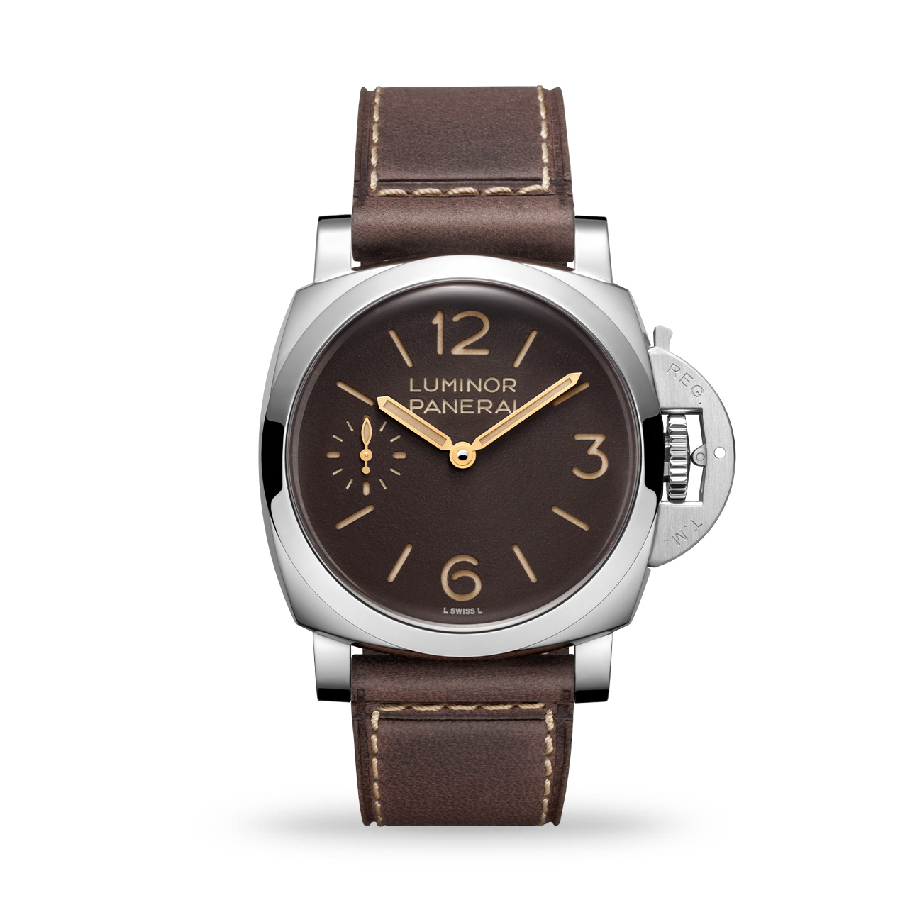 The Panerai Luminor PAM01731 embodies the brand’s iconic tool-watch heritage, reinterpreting its 1960s military design in a bold 44mm polished steel case. The tobacco brown sandwich dial, complete with luminous Arabic numerals and a small seconds sub-dial at 9 o’clock, ensures exceptional legibility while reinforcing its vintage character. Powered by the hand-wound P.6000 calibre, it offers a reliable three-day power reserve, staying true to Panerai’s tradition of robust, precision engineering. Water-resistant to 300 metres and paired with both leather and rubber straps, it delivers a perfect balance of heritage styling and everyday versatility.