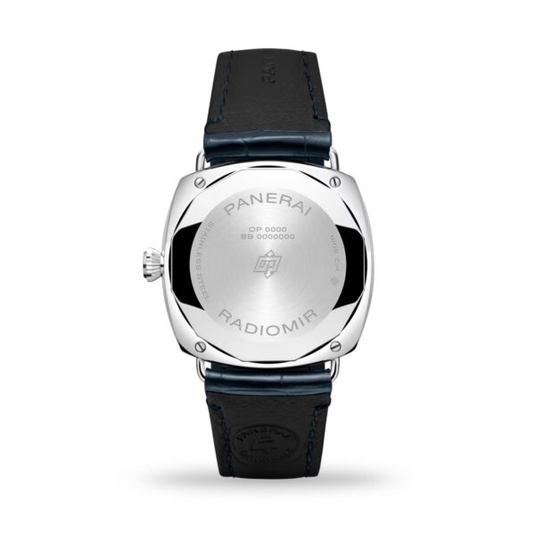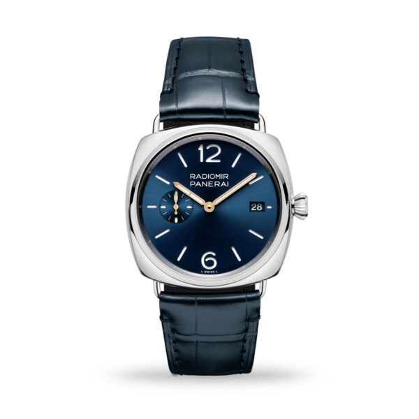 The Radiomir Quaranta 40mm has a blue dial with luminous Arabic numerals and hour markers. Includes date at 3 o’clock and small seconds at 9 o’clock, on a blue alligator leather strap with stitching.