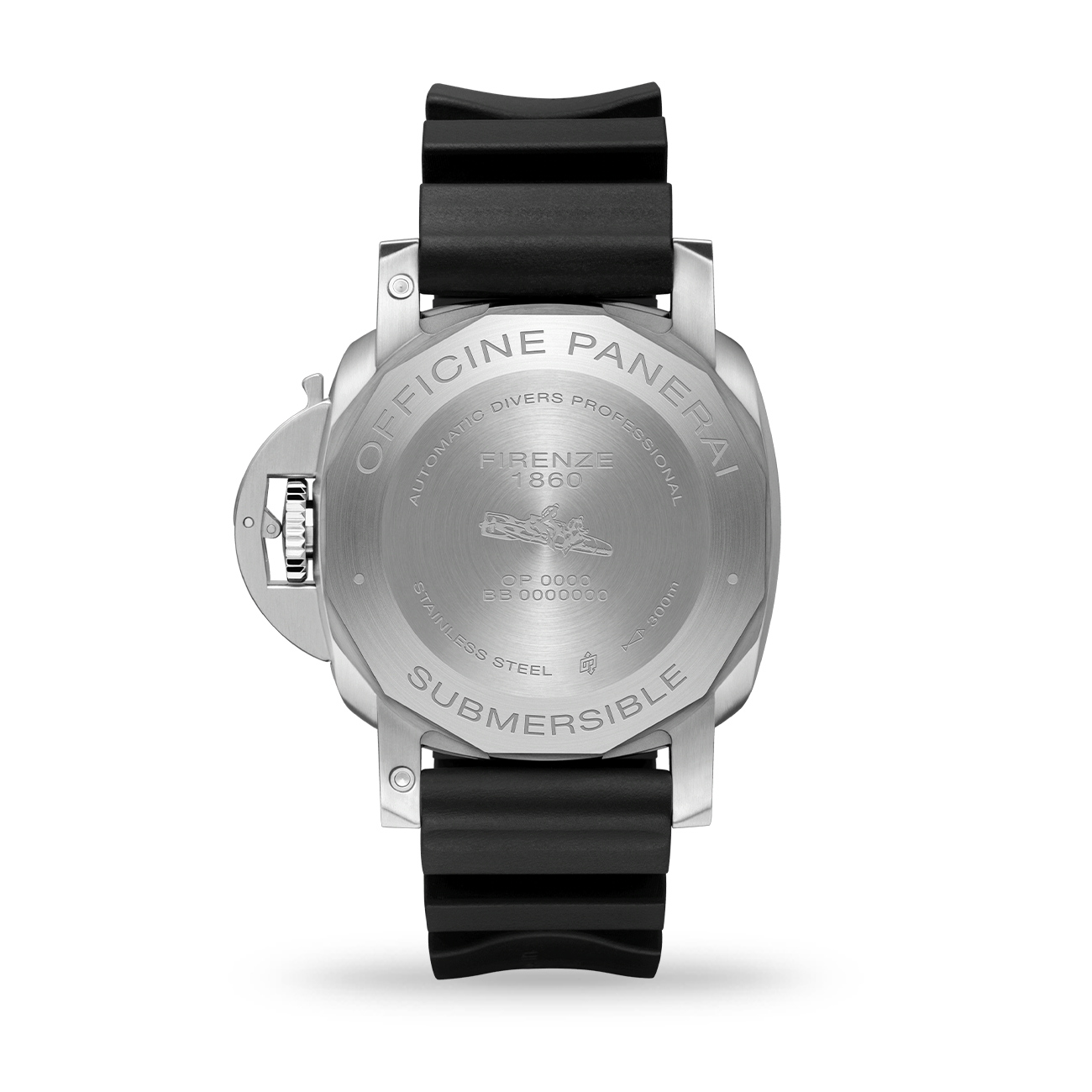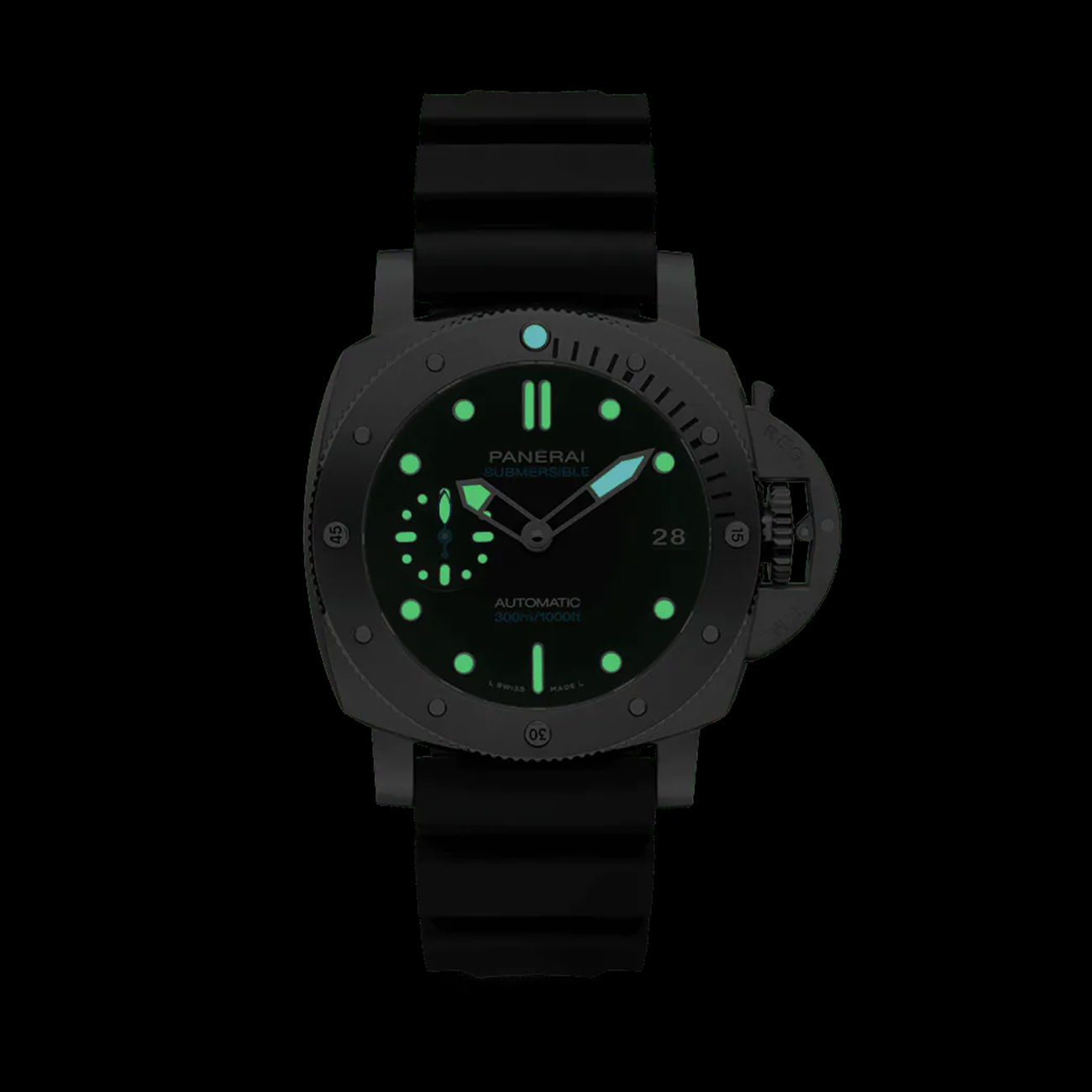 This Panerai Submersible 42mm is designed for durability, featuring a black dial with luminous hour markers and dots. All of which is housed in a steel case and attached to a black rubber strap. Alongside the small seconds and date display, this model is powered by the P.900 Calibre movement.