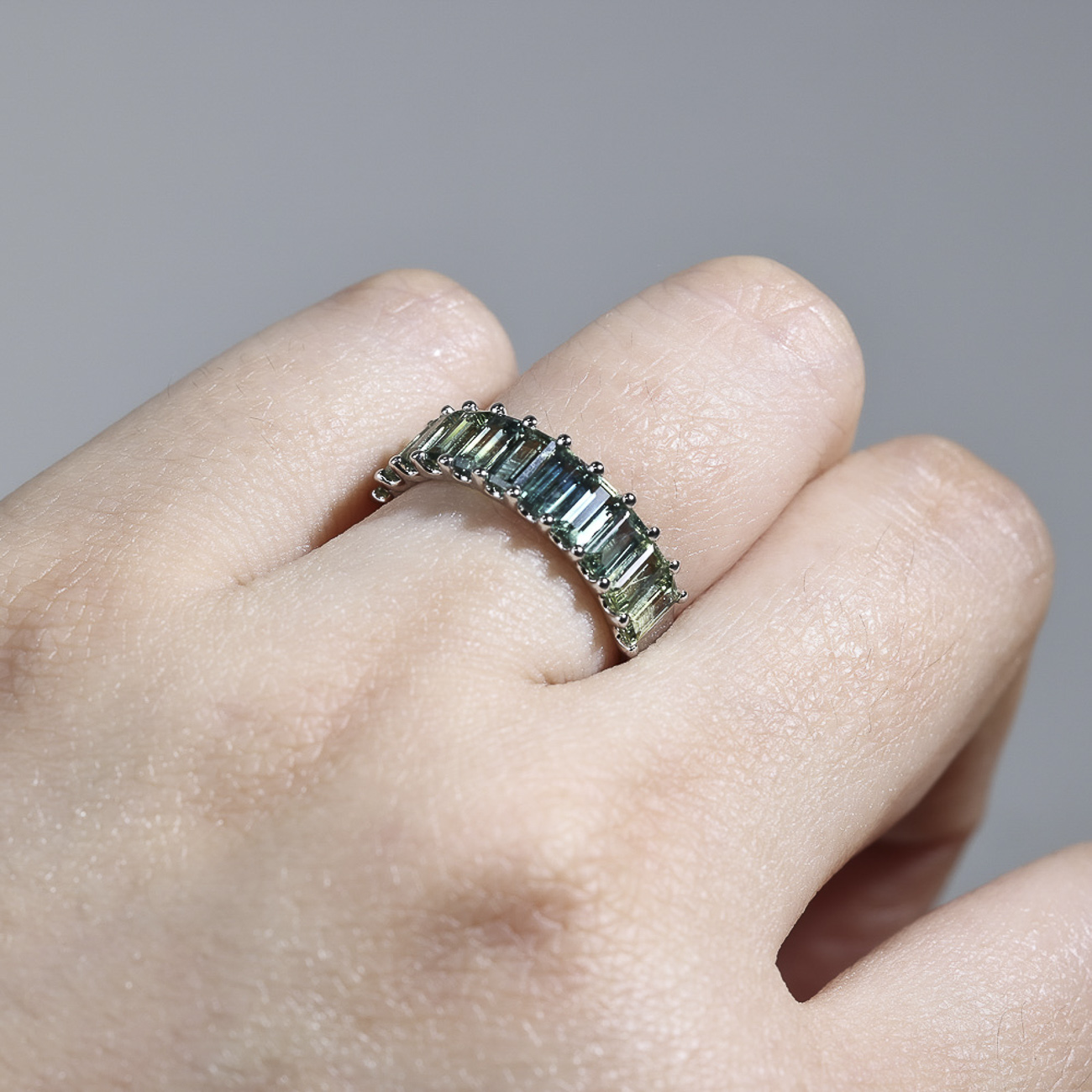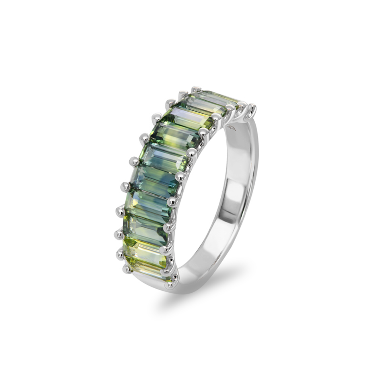 The Lennox Ring in 9K white gold is a striking celebration of colour and contemporary design. Featuring a bold row of 11 baguette-cut parti Australian sapphires, each gemstone is meticulously set to showcase its unique hues and brilliance. The clean, modern lines of the band create a refined silhouette, balancing boldness with elegance. Perfect for statement-making occasions or as a standout addition to a fine jewellery collection, the Lennox Ring exemplifies exceptional craftsmanship and the captivating beauty of Australian sapphires.