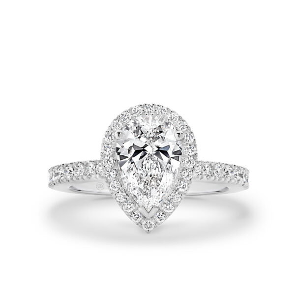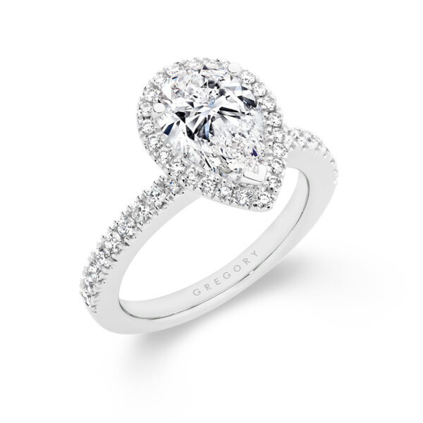 5 - 7 business daysFrom our Precious Halo Collection, this Gregory Diamond Engagement ring is a promise of everlasting Love. Handcrafted in 18K White Gold, featuring a Pear Cut Diamond set in a 3-claw setting and 42 Round Brilliant Cut Diamonds set in a claw setting on the band and halo.