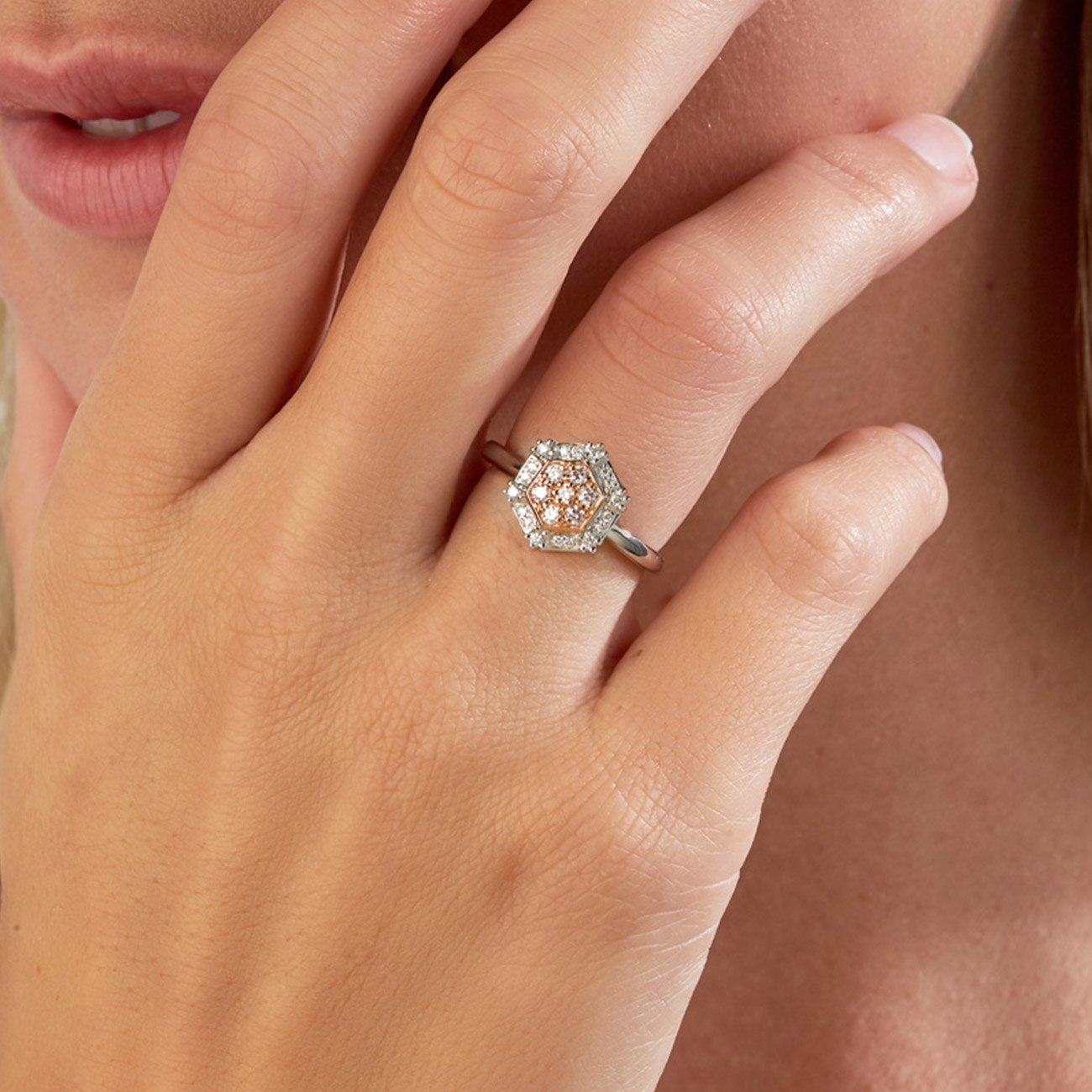 The Blush Imperium Ring displays a cluster of beautiful fancy light pink diamonds from the Argyle diamond mine, surrounded by a hexagonal halo of sparkling white diamonds. This ring is elegant and stylish, crafted in 18k white and rose gold.