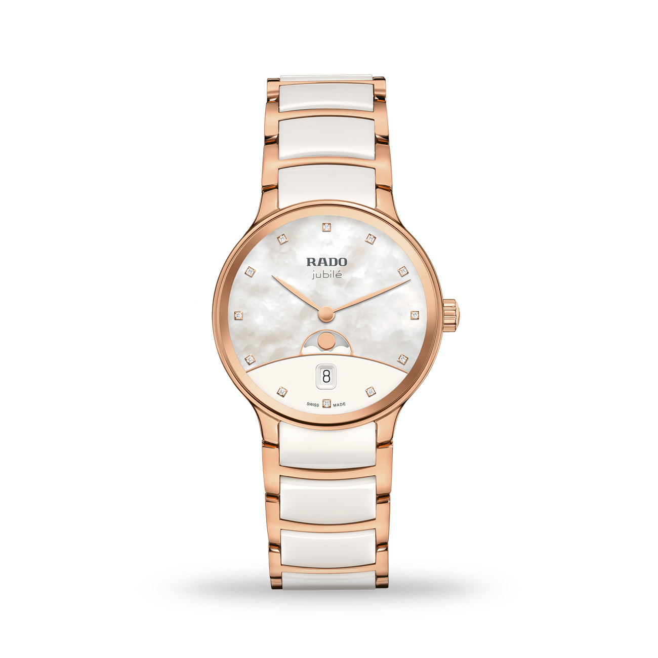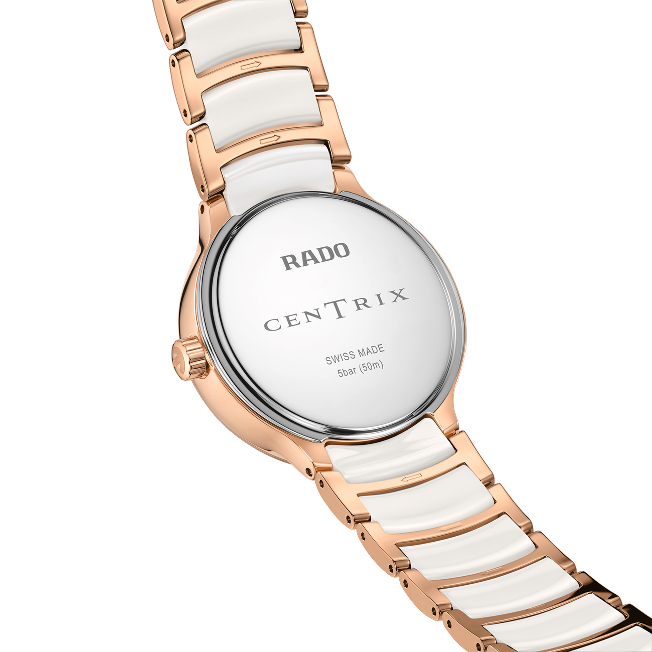 This Rado Centrix 35mm watch (model R30232922) combines elegant rose gold tones with classic Swiss craftsmanship. Its polished rose gold coloured PVD stainless steel case and bracelet feature white high-tech ceramic centre links for a modern, luxurious look. The white mother-of-pearl dial is adorned with 12 Jubilé diamonds, protected by curved sapphire crystal. Powered by a Swiss quartz movement, this refined timepiece offers reliable performance, understated sparkle, and timeless everyday sophistication — a luxurious statement you’ll cherish every day.