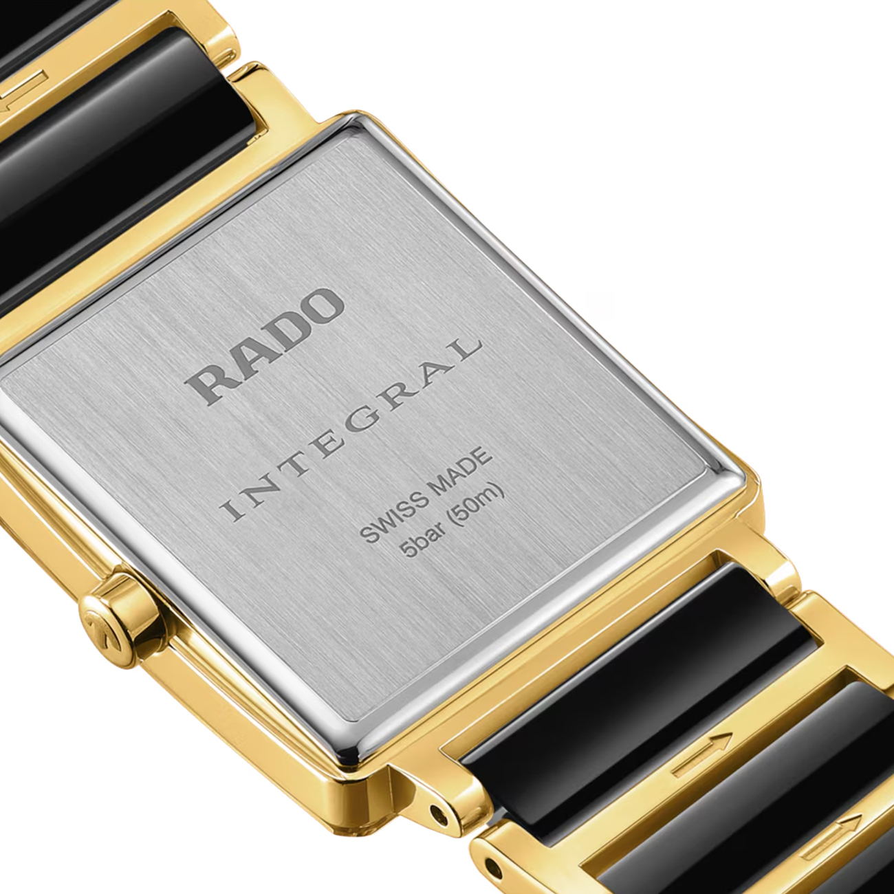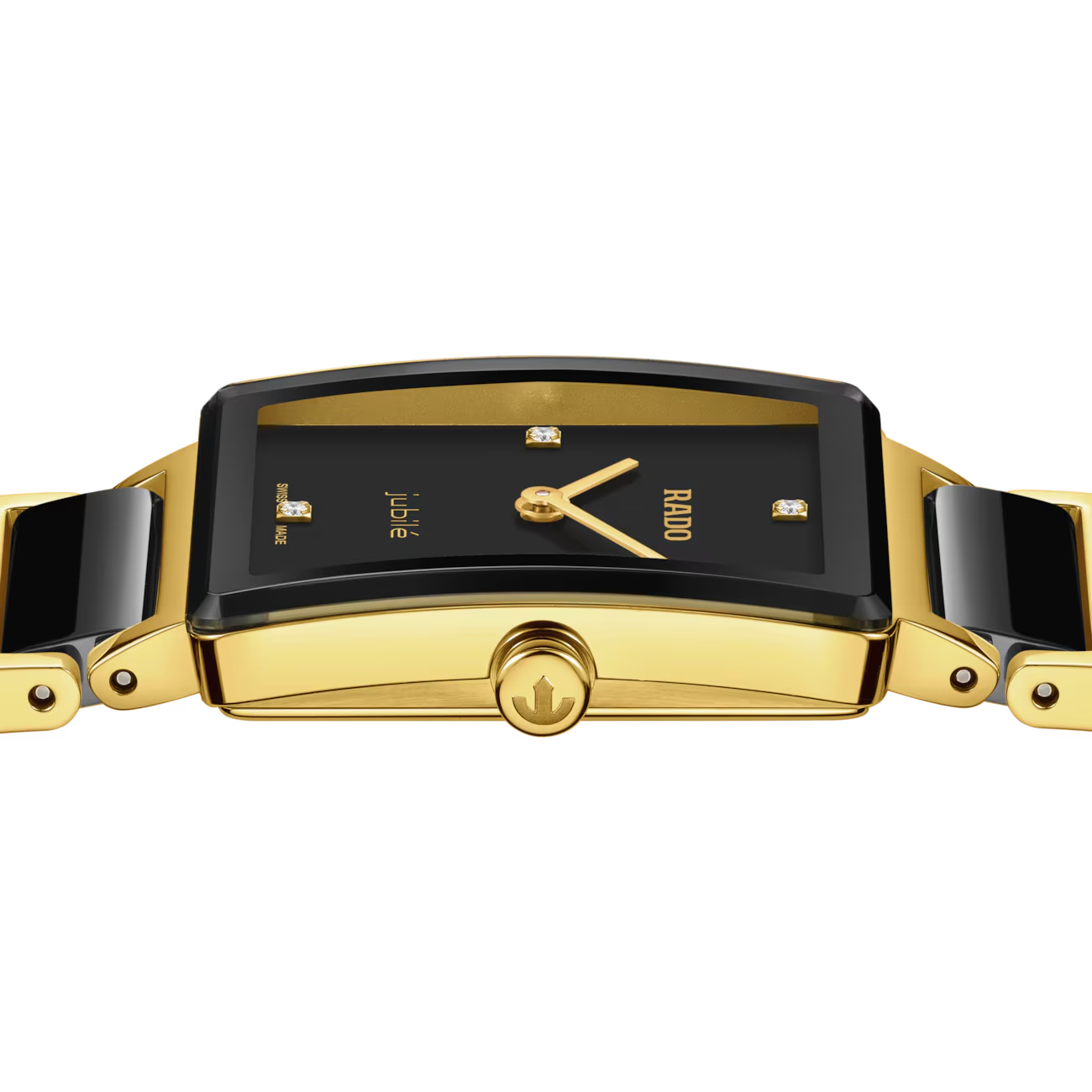 The Rado Integral Diamonds R20252702 is a refined Swiss-made ladies’ watch with a 23 mm yellow gold-PVD stainless steel and black high-tech ceramic case and bracelet that blends luxury and comfort. A deep black lacquered dial is set with four brilliant diamonds and protected by an anti-reflective, edge-to-edge curved sapphire crystal. Powered by the precise Swiss R209 quartz movement with two hands, its slim profile and signature minimalist design deliver timeless elegance for every occasion.