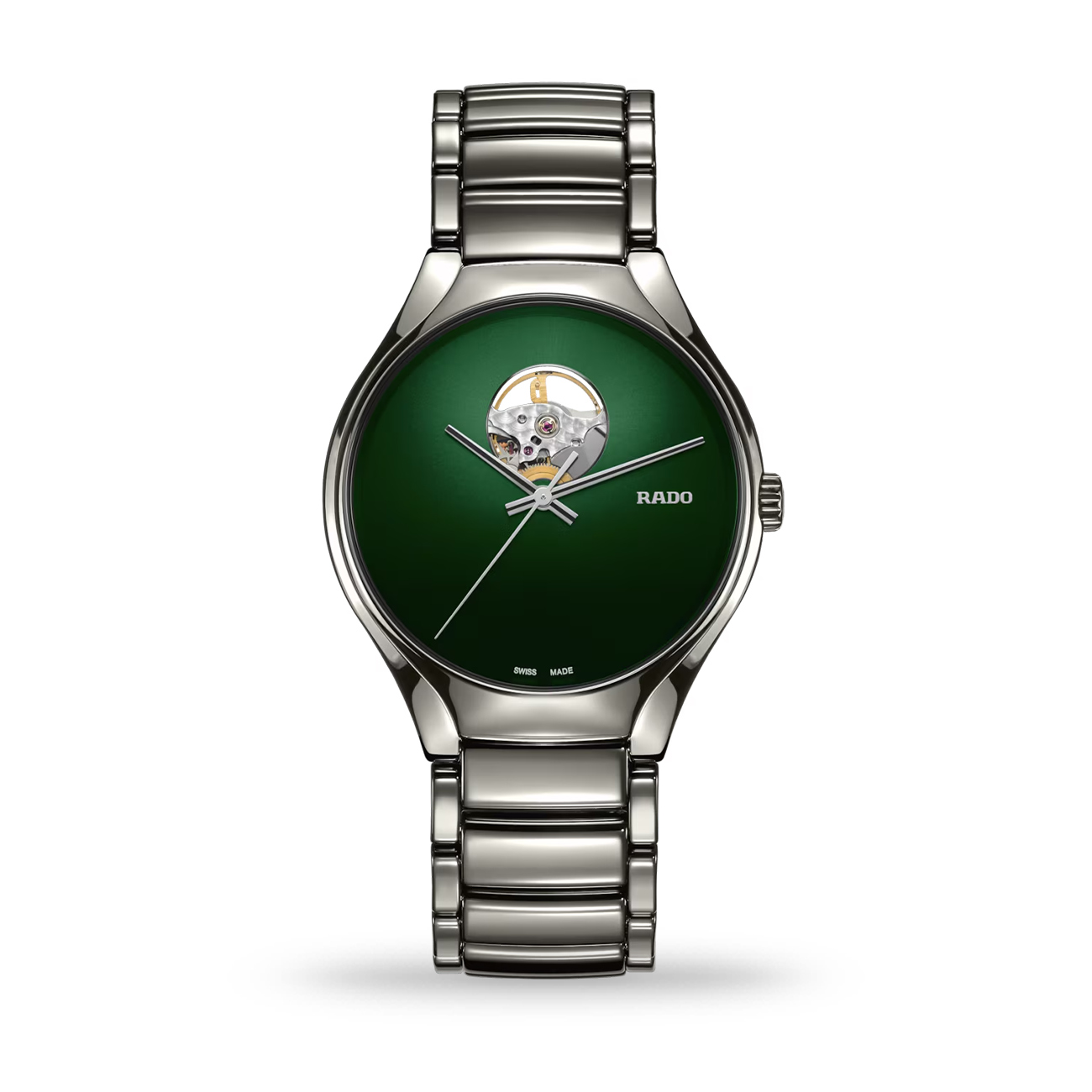 Experience modern Swiss elegance with the Rado True Secret 40 mm automatic watch (model R27108312). Crafted in polished plasma high‑tech ceramic and titanium, this unisex timepiece features a striking green dial with an open‑balance view at 12 o’clock that reveals the premium Swiss automatic movement. Powered by a reliable 80‑hour calibre and protected by curved sapphire crystal, it blends comfort, durability and distinctive design — a perfect luxury watch to cherish or gift with lasting style.