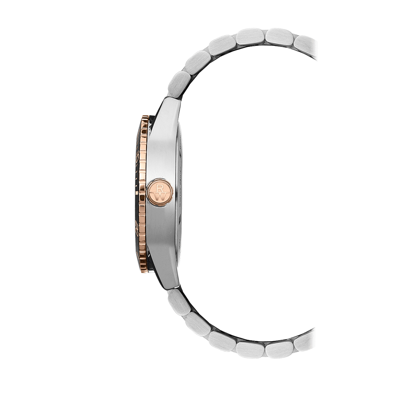 This Raymond Weil Freelancer 42mm features a stainless steel case with rose Gold PVD coating and a black ceramic bezel and fitted with a stainless steel bracelet. This model is powered by the mechanical movement with automatic winding and has a water resistance of 300 meters.