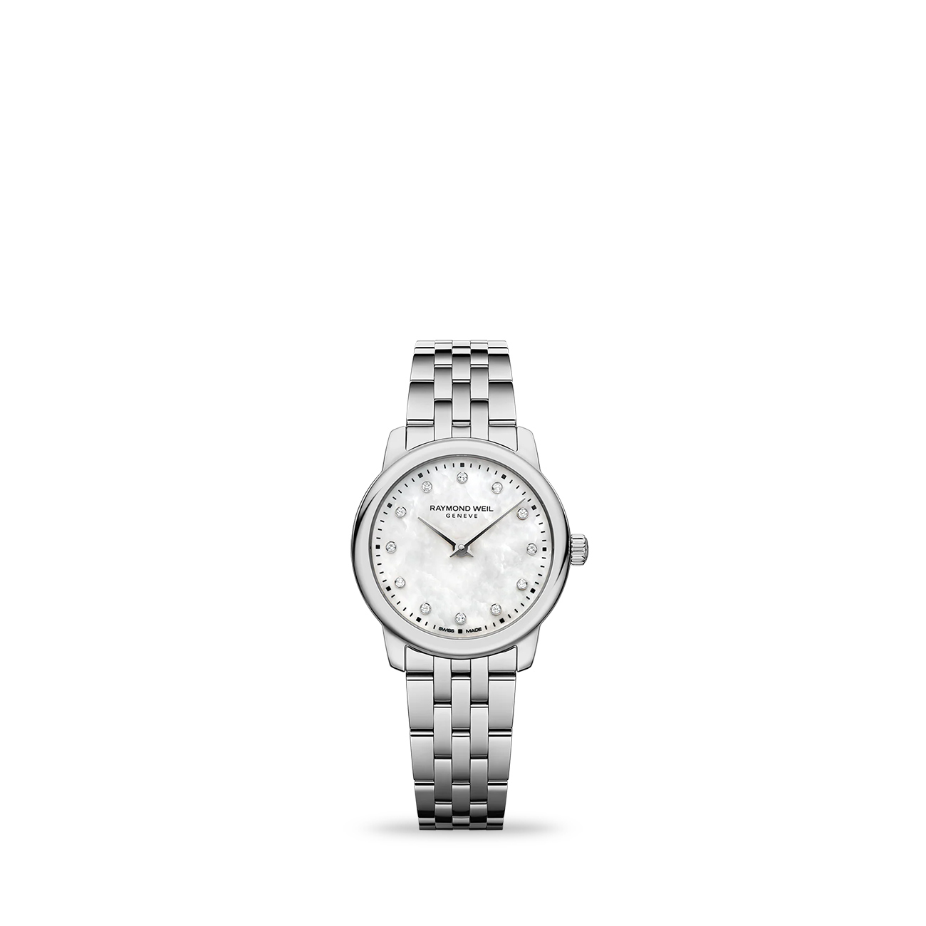 5 - 7 business daysThe Raymond Weil Toccata Classic 24mm offers a refined expression of timeless elegance in a sleek design. Crafted in stainless steel with a matching bracelet, this sophisticated timepiece features a luminous white mother-of-pearl dial, delicately set with 12 lab-grown diamond hour markers for a subtle touch of brilliance. Its slim, minimalist profile is enhanced by a clean no-date display, while a precise Swiss quartz movement ensures reliable everyday performance. Finished with a scratch-resistant sapphire crystal and 50 metres water resistance, this Toccata embodies understated luxury and enduring style.