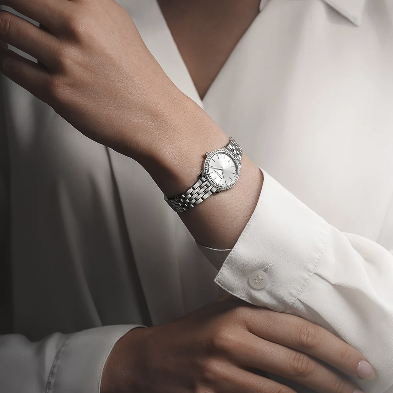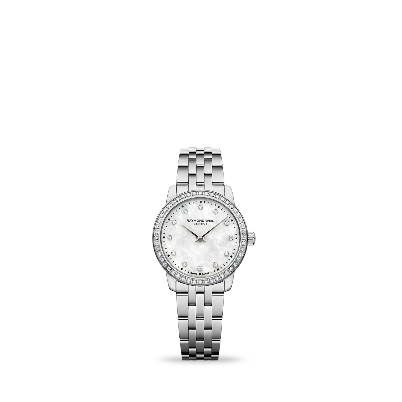 5 - 7 business daysThe Raymond Weil Toccata Classic 24mm is a refined expression of timeless elegance in a sleek stainless steel design. Crafted with a polished case and matching bracelet, it features a luminous white mother-of-pearl dial set with 12 lab-grown diamond hour markers for a delicate, radiant finish. A diamond-set bezel adds an extra touch of brilliance, beautifully framing the dial. Powered by precise Swiss quartz movement, this timepiece offers reliable everyday performance, while a scratch-resistant sapphire crystal and 50 metres water resistance ensure lasting durability.