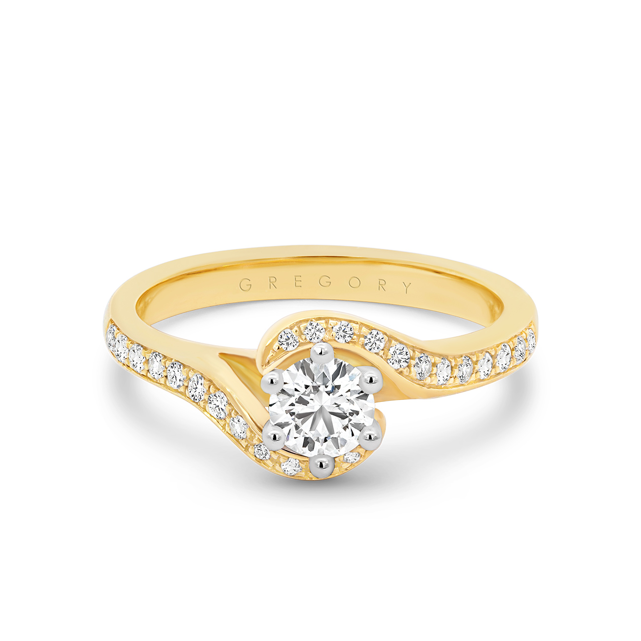 This exquisite 0.34ct round brilliant diamond ring is beautifully crafted in 18K yellow and white gold, featuring a unique crossover design that adds movement and elegance. The centre diamond is complemented by 24 diamonds set along the band, creating a continuous sparkle that enhances its brilliance. Perfect as an engagement ring to be treasured for a lifetime.
