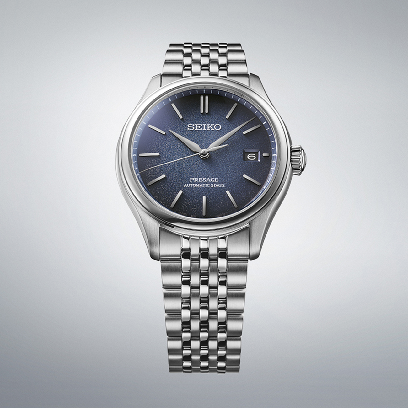 The Seiko Presage Classic Series 40.2mm SPB525J embodies Japanese elegance with its ‘Ai-iro’ dial – a rich indigo blue reminiscent of the Edo period. The 40.2mm stainless steel case features a polished finish and is complemented by a seven-row bracelet, offering both durability and refined aesthetics. Powered by the Calibre 6R55 automatic movement, it boasts a 72-hour power reserve visible through the exhibition case back and offers 100 metres water resistance. This timepiece is a testament to Seiko’s commitment to craftsmanship and design.