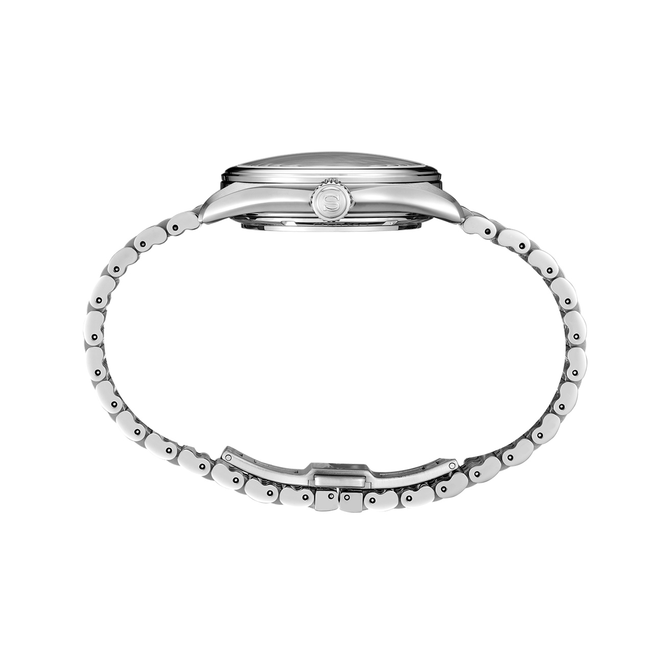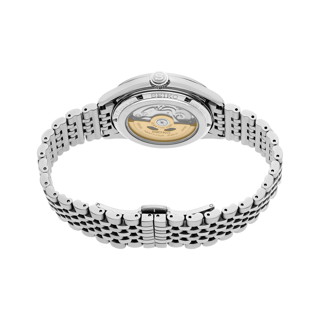 The Seiko Presage Classic Series 40.2mm blends traditional Japanese style with modern precision. Its indigo “Ai-iro” dial, inspired by the revered samurai colour, features a captivating sunray finish and 24-hour subdial. The open-heart design offers a glimpse into the intricate workings of the Caliber 6R5J automatic movement, which provides a 72-hour power reserve. The stainless steel case with matching seven-row bracelet is inspired by 1970s design. In addition to the see-through case back, this SPB527J model is is water resistant to 100 metres.