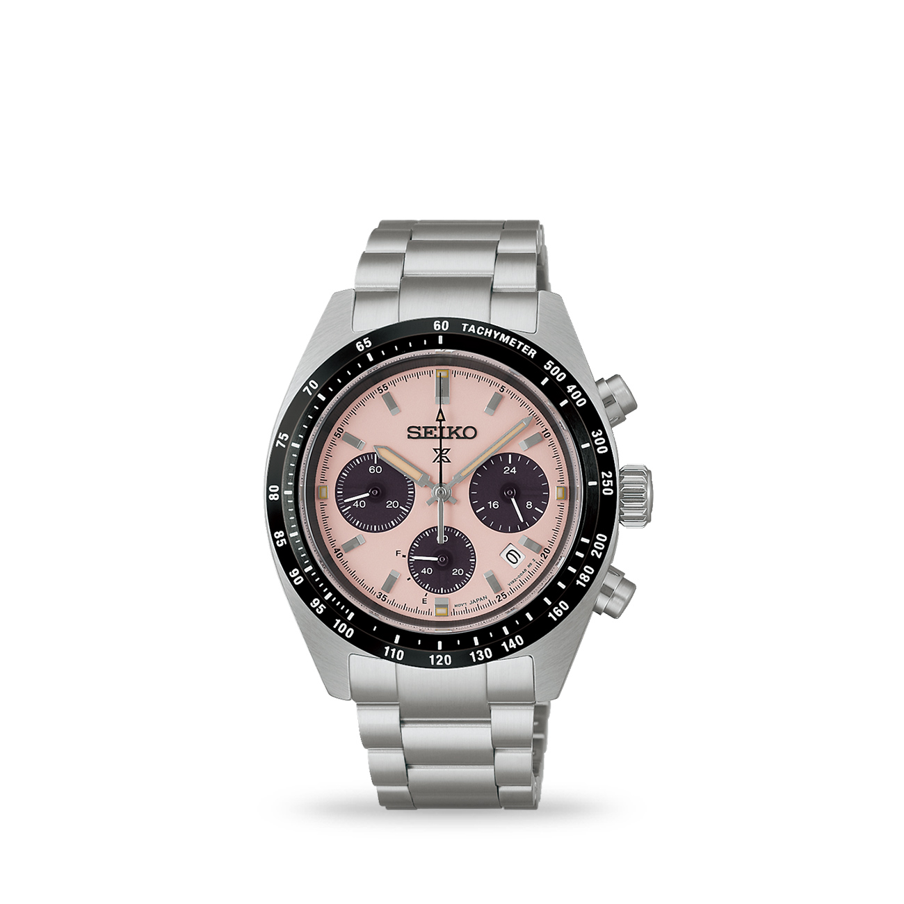 5 - 7 business daysThis Seiko Prospex Speedtimer Solar Chronograph SSC963P is a versatile 39 mm stainless steel watch powered by Seiko’s efficient V192 solar movement with up to 6 months of power reserve and ±15 sec/month accuracy. Its vibrant pink dial features chronograph subdials, a date window and luminous hands under a curved sapphire crystal with anti-reflective coating. With a tachymeter scale, 100 meters water resistance and a robust bracelet, this stylish chronograph blends racing heritage with modern reliability.