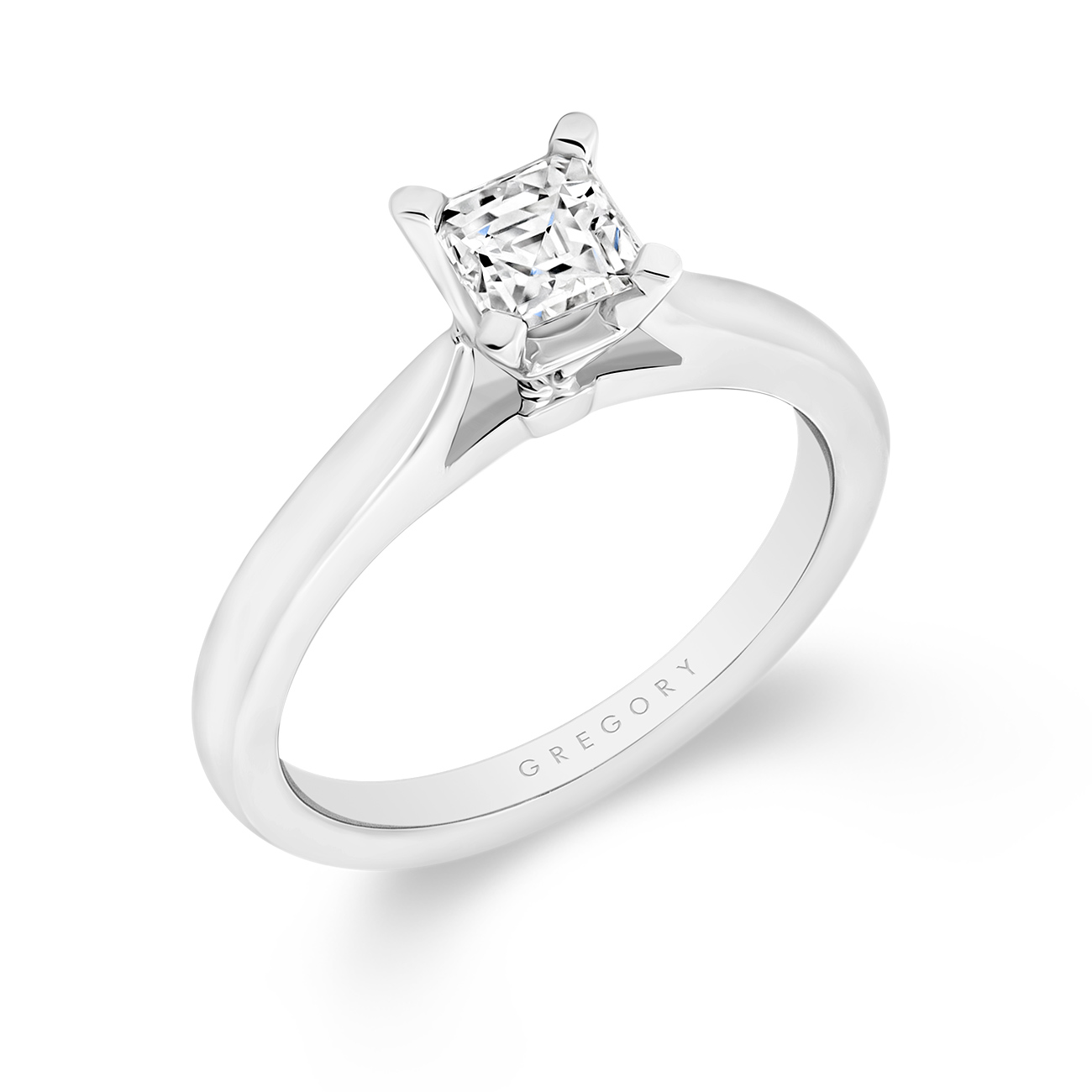 This Gregory Diamond engagement ring is designed to be treasured forever. Handcrafted in 18K white gold, it features a striking 0.53ct Square Tycoon Cut diamond secured in a refined four-corner claw setting, gracefully floating above a smooth, curved tapered band. A perfect balance of modern elegance and timeless craftsmanship, this ring is a true symbol of enduring love.