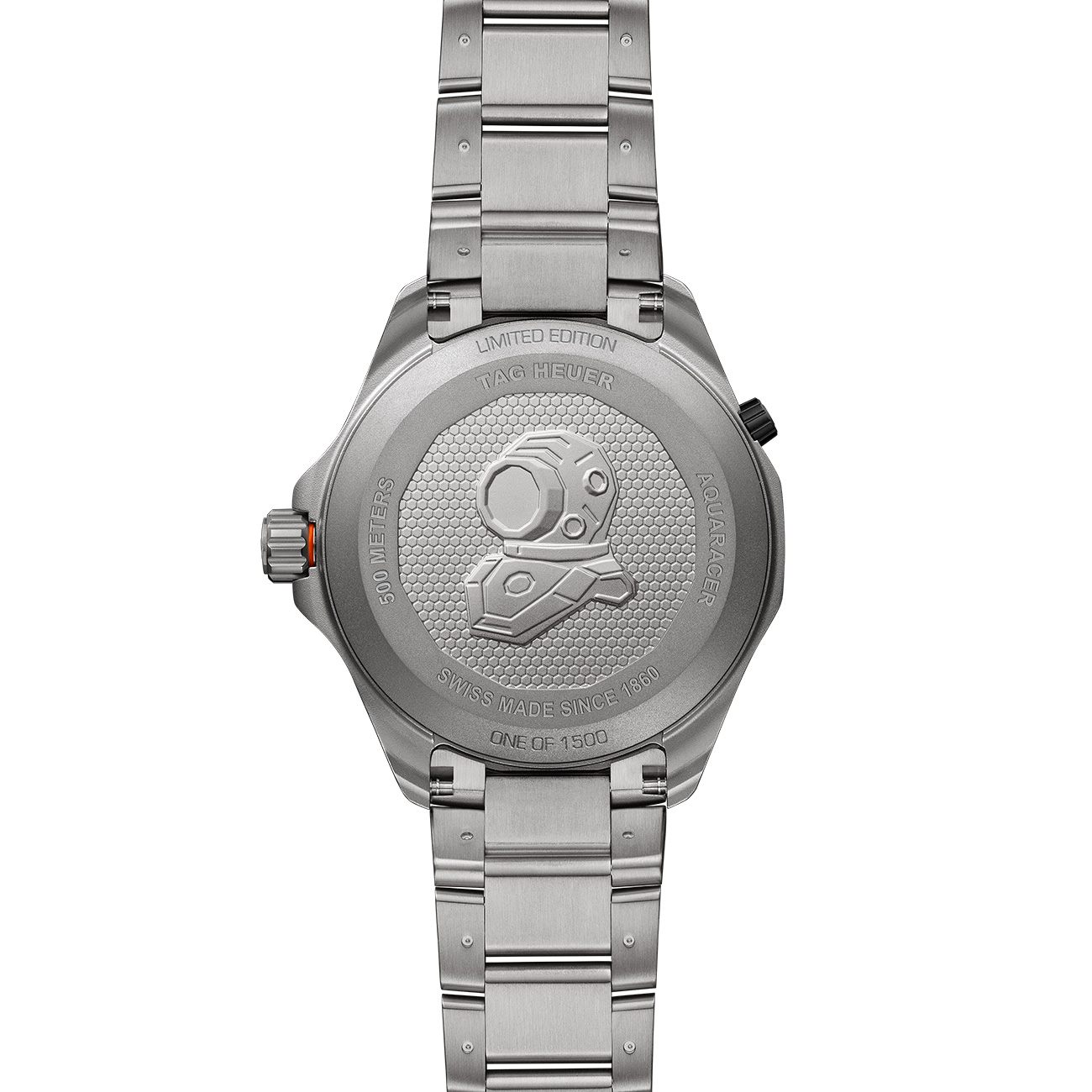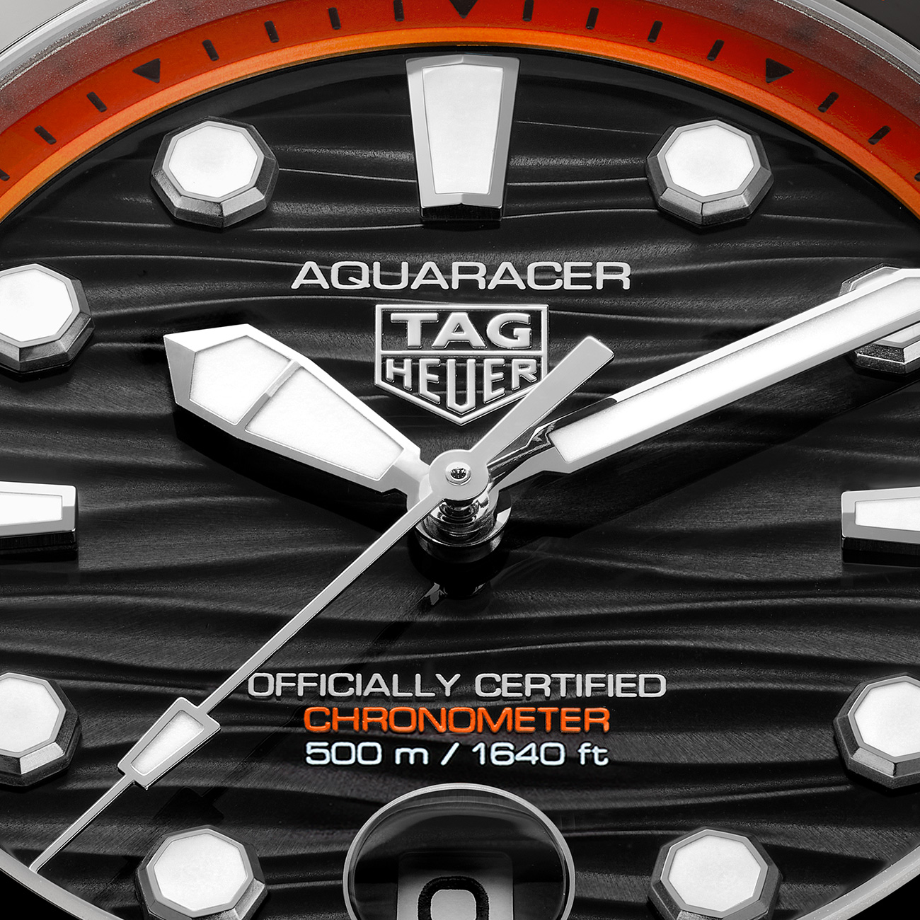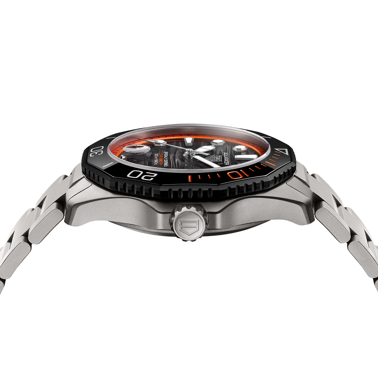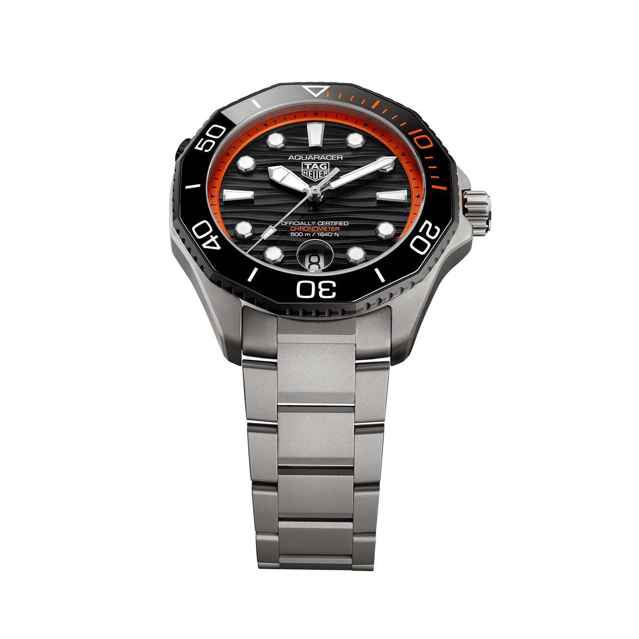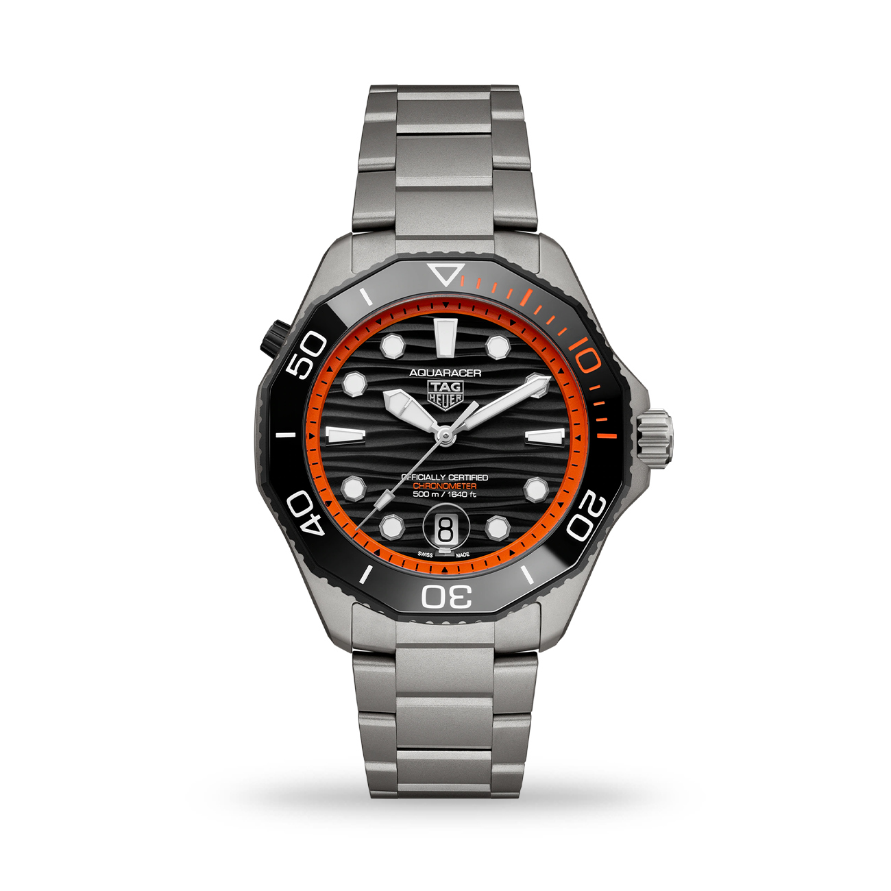 Bold and uncompromising, the TAG Heuer Aquaracer Professional 500 Date stands out with its orange-accent design and black lacquered dial. With a sandblasted grade 2 titanium 42mm case powered by the COSC-certified Calibre TH30-00, and ISO 6425-compliant for diving watches, it guarantees precision down to 500 metres. It comes in a resilient Pelicase with signature orange details and an integrated backup light, ready to accompany every adventure.