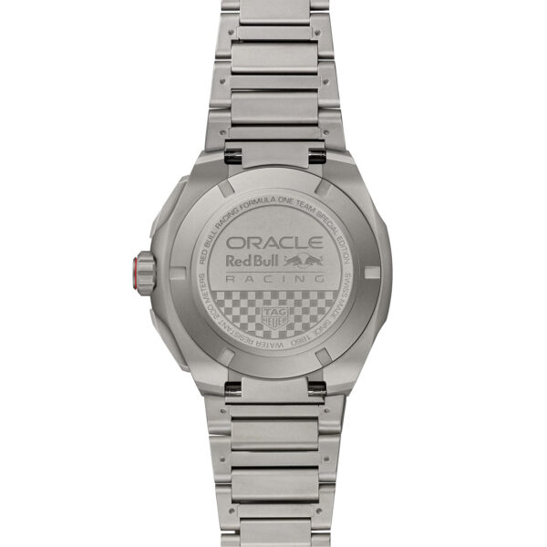 Crafted from ultra-lightweight titanium, the TAG Heuer Formula 1 Chronograph x Oracle Red Bull Racing Special Edition embodies the thrill of precision engineering and high-performance racing. Its 44mm sandblasted titanium case features an opalin blue dial with a subtle checkered-flag motif, three high-contrast subdials, and rhodium-plated hands enhanced with Super-LumiNova® for outstanding legibility. A fixed black and grey carbon tachymeter bezel reinforces its racing DNA, while the automatic Calibre 16 movement ensures reliability and endurance. Water-resistant to 200 metres and fitted with a three-row titanium bracelet, this chronograph is built to perform under pressure.