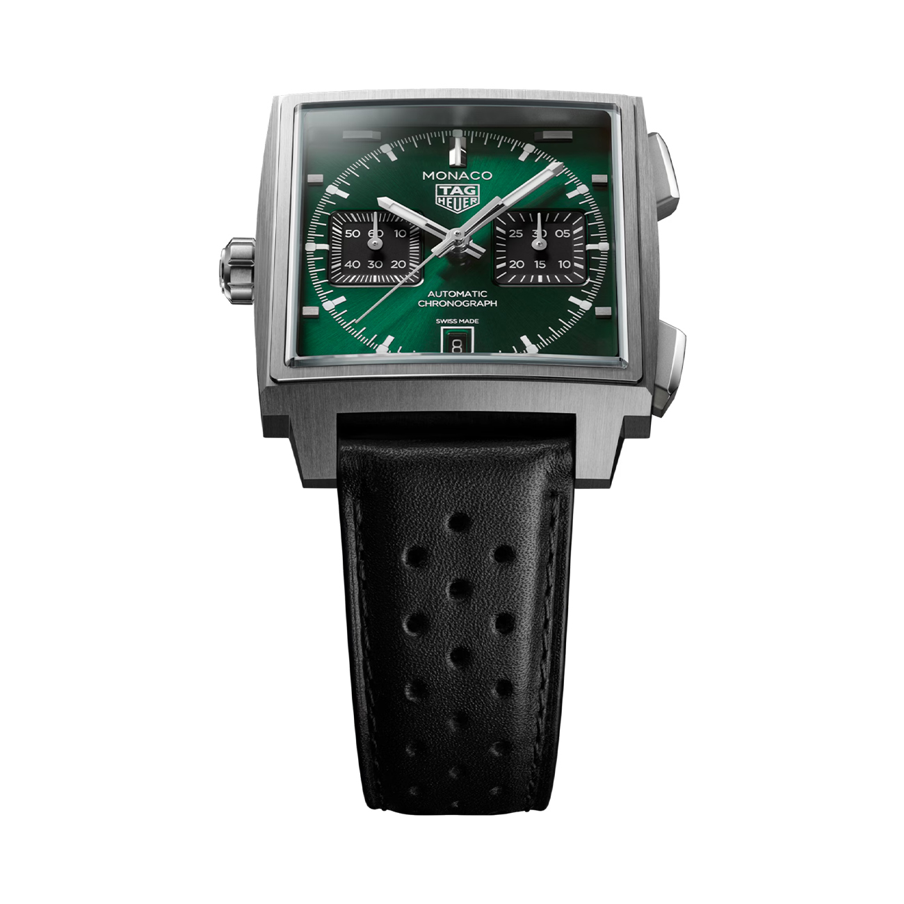 This 39mm TAG Heuer Monaco Chronograph in grade 5 titanium pairs a green sunray-brushed dial with the in-house Calibre TH20-11 offering an 80-hour power reserve. Featuring black opaline counters, luminous rhodium-plated hands, and a black calfskin leather strap, it merges ergonomic design and modern precision behind a sapphire caseback that reveals the watch’s mechanical heart.
