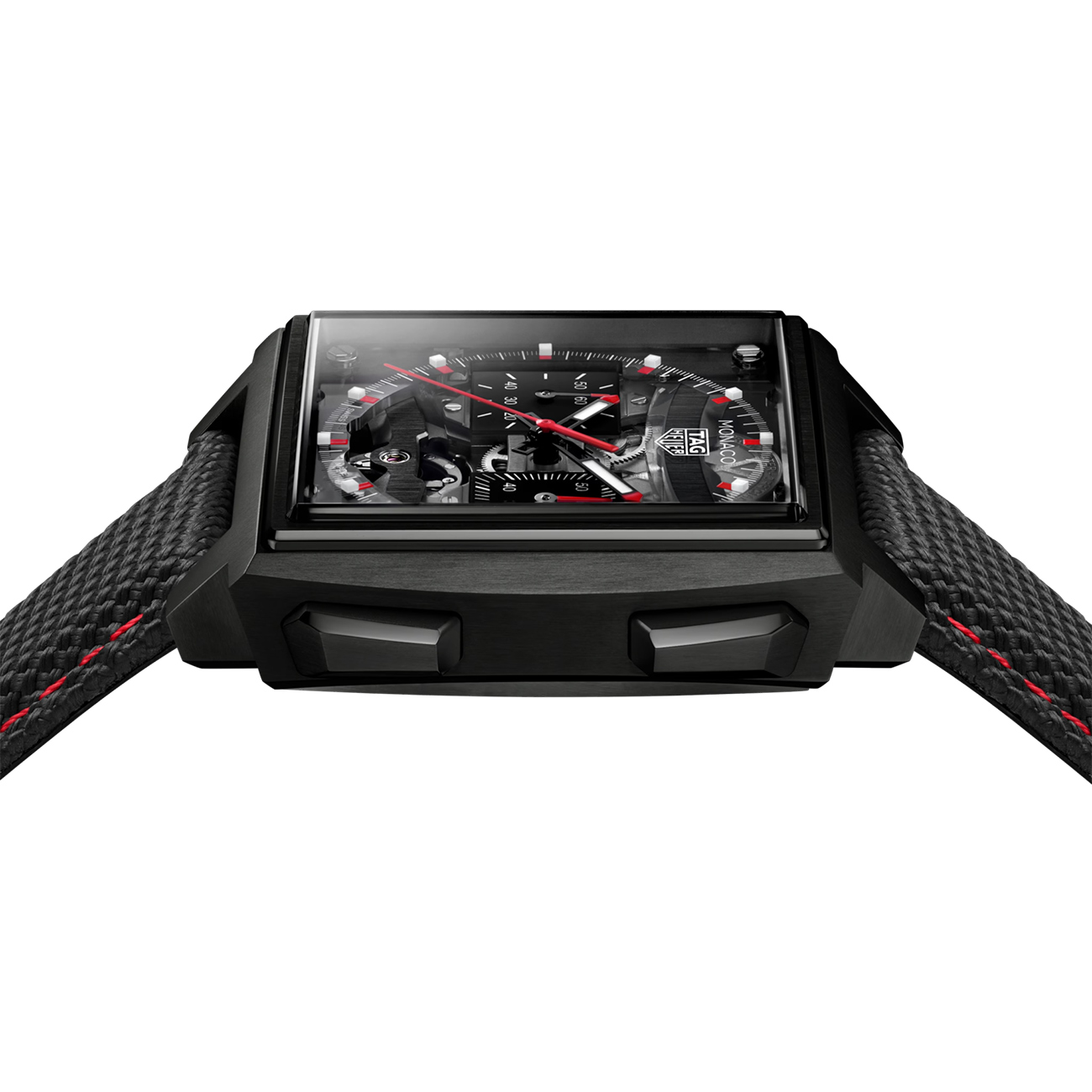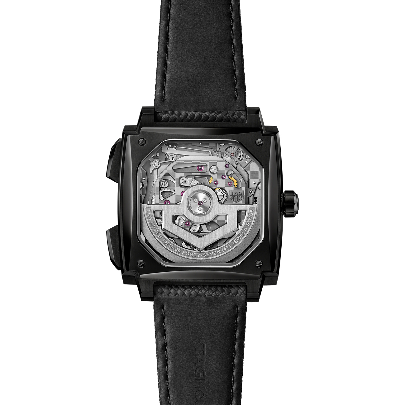The TAG Heuer Monaco Evergraph in black DLC titanium fuses strength with innovation. Its movement, the Calibre TH80-00, features a groundbreaking compliant chronograph mechanism built with flexible components and TAG Heuer’s TH-Carbonspring oscillator, both ensuring maximum reliability. The translucent dial, red accents, and black rubber strap highlight its bold spirit, while the sapphire caseback reveals the movement’s avant-garde architecture.
