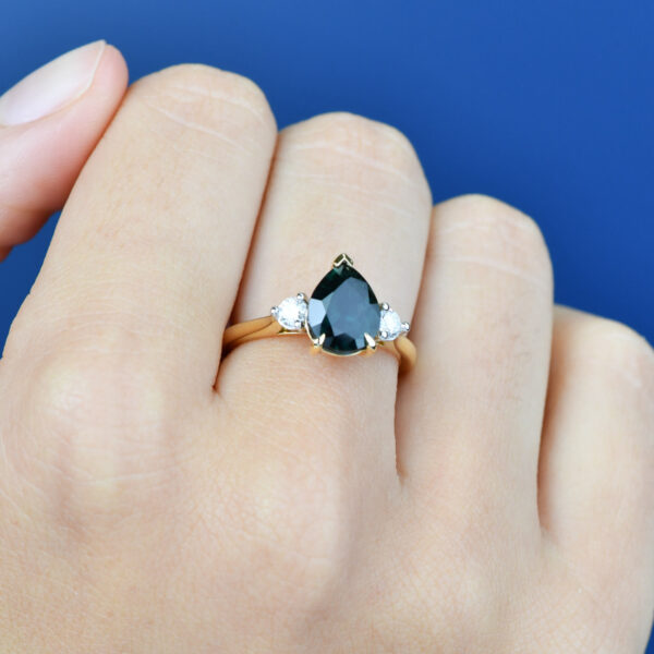 The Sapphire Dreams Endota ring showcases a stunning teal pear-shape Australian sapphire surrounded by two sparkling white diamonds. This trilogy ring is sure to impress as an engagement ring or stunning dress ring, beautifully crafted in 18K white and yellow gold.