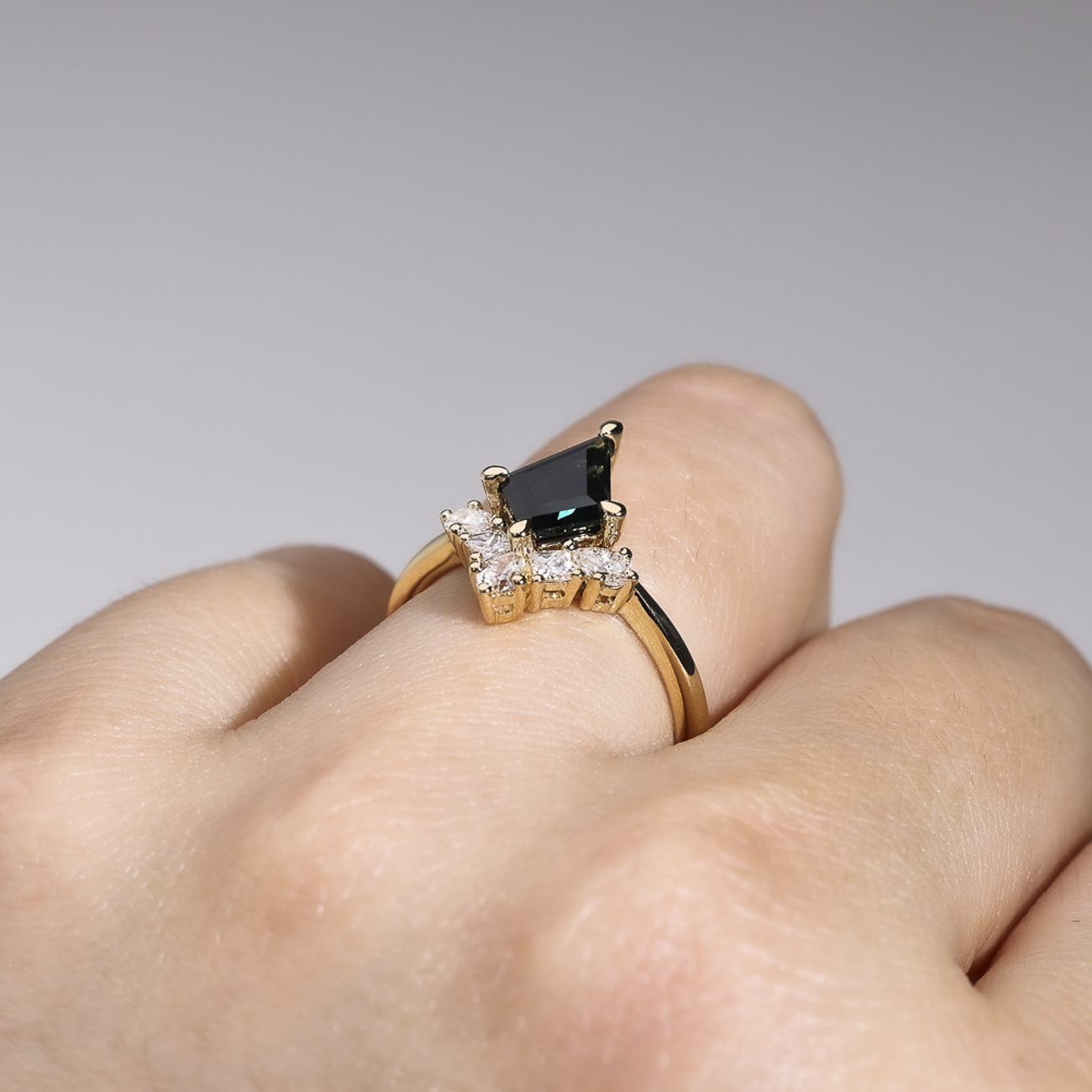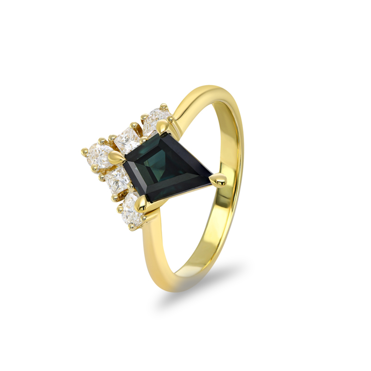 The Kendra Ring in 18k yellow gold is a striking blend of modern geometry and sophisticated elegance. Showcasing a unique kite-shaped blueish teal Australian sapphire, surrounded by an artful array of pear-cut and princess-cut diamonds. The geometric arrangement of gemstones creates a bold yet refined statement, highlighting the vivid colour of the sapphire and the brilliance of the diamonds.