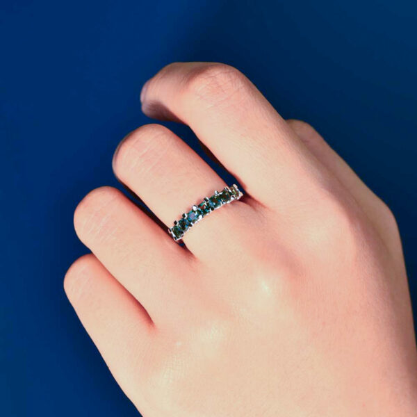 An elegant band of princess cut Australian Sapphires, the Iris ring makes for a beautiful wedding band or addition to your daily style. This piece is also crafted in 9 karat White, Rose or Yellow Gold, allowing you to find the perfect match.