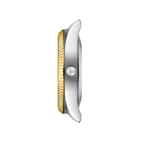 The Tissot Ballade 39mm radiates timeless elegance with its silver sunray dial, beautifully catching the light. Polished yellow gold Roman numerals and hands complement the fluted bezel, whose finely cut ridges add depth and texture, showcasing the artistry of traditional Swiss watchmaking. A discreet date window at 3 o’clock adds practical functionality, while the COSC-certified automatic movement, visible through the transparent case back, delivers exceptional precision and long-term reliability. The two-tone stainless steel case with yellow gold PVD and matching bracelet completes this timepiece, combining everyday durability with refined Swiss sophistication.