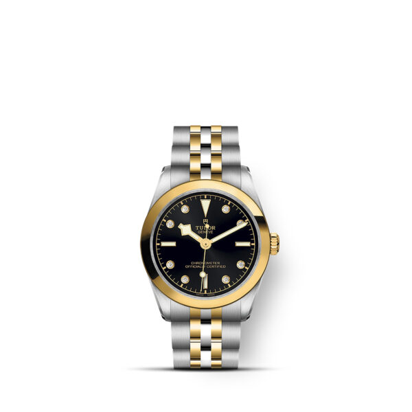 This Tudor Black Bay S&G 31mm provides a sophisticated and versatile look, featuring a black dial with diamond hour markers and luminescent snowflake hands, on a stainless steel case with yellow gold bezel and winding crown that has the Tudor rose in relief. Fitted on a matching two-tone metal bracelet with a folding clasp to complete the chic aesthetic. In addition to 100 meters of water resistance, this model is powered by the COSC-certified MT5201 Calibre offering up to 50 hours power reserve.