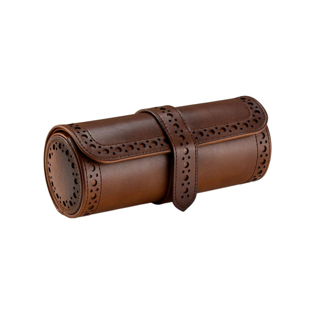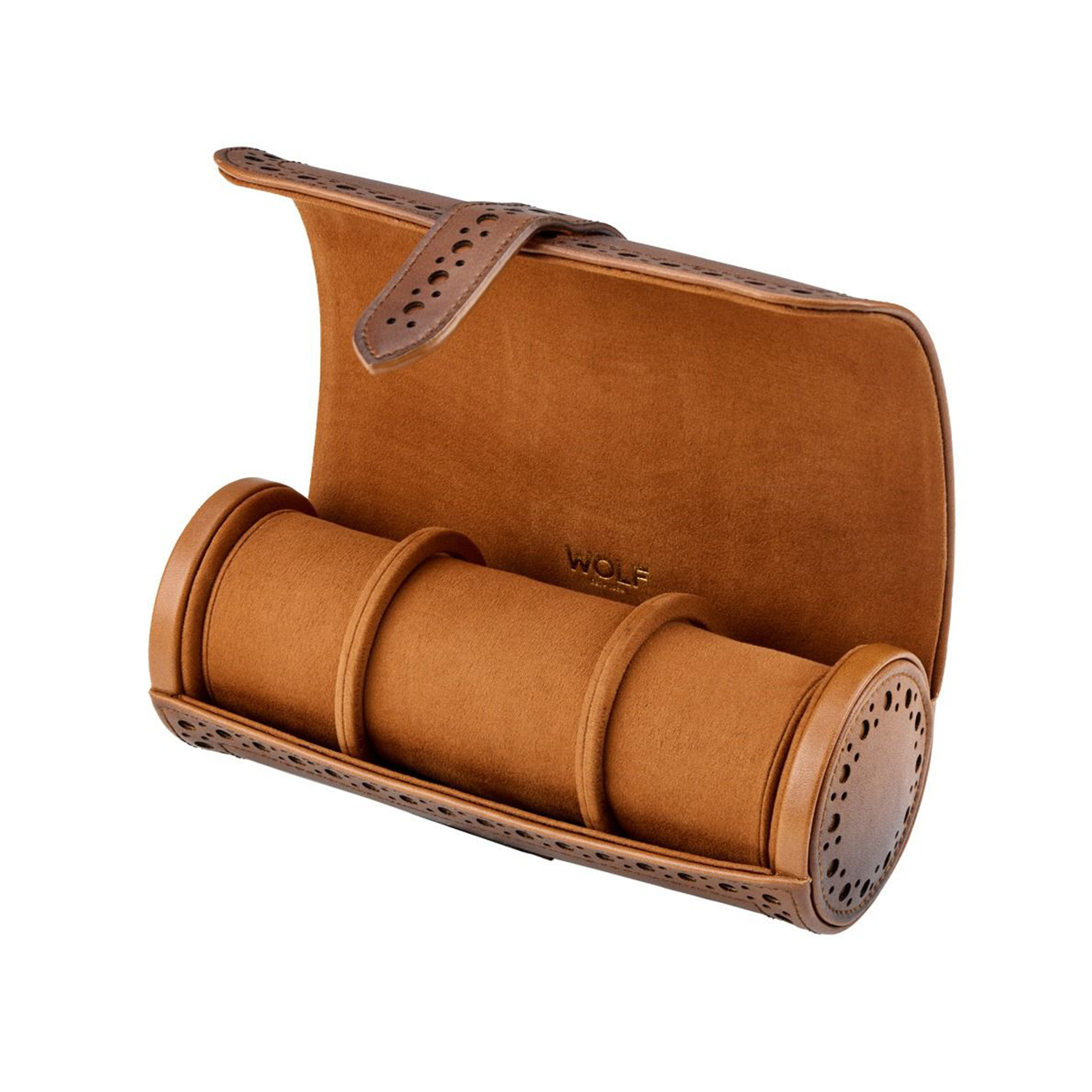 This WOLF Brogue Triple Watch Roll combines heritage craftsmanship with modern travel functionality. Crafted from burnished plant-based material and finished with Old English brass hardware, it reflects the timeless detailing of classic brogue shoes. Designed for secure travel, it stores up to three watches with protective Watch Guards and an adjustable snap closure. A hidden jewellery capsule with three compartments adds versatility, while the Ultrasuede lining ensures your timepieces remain protected in refined, sustainable style.