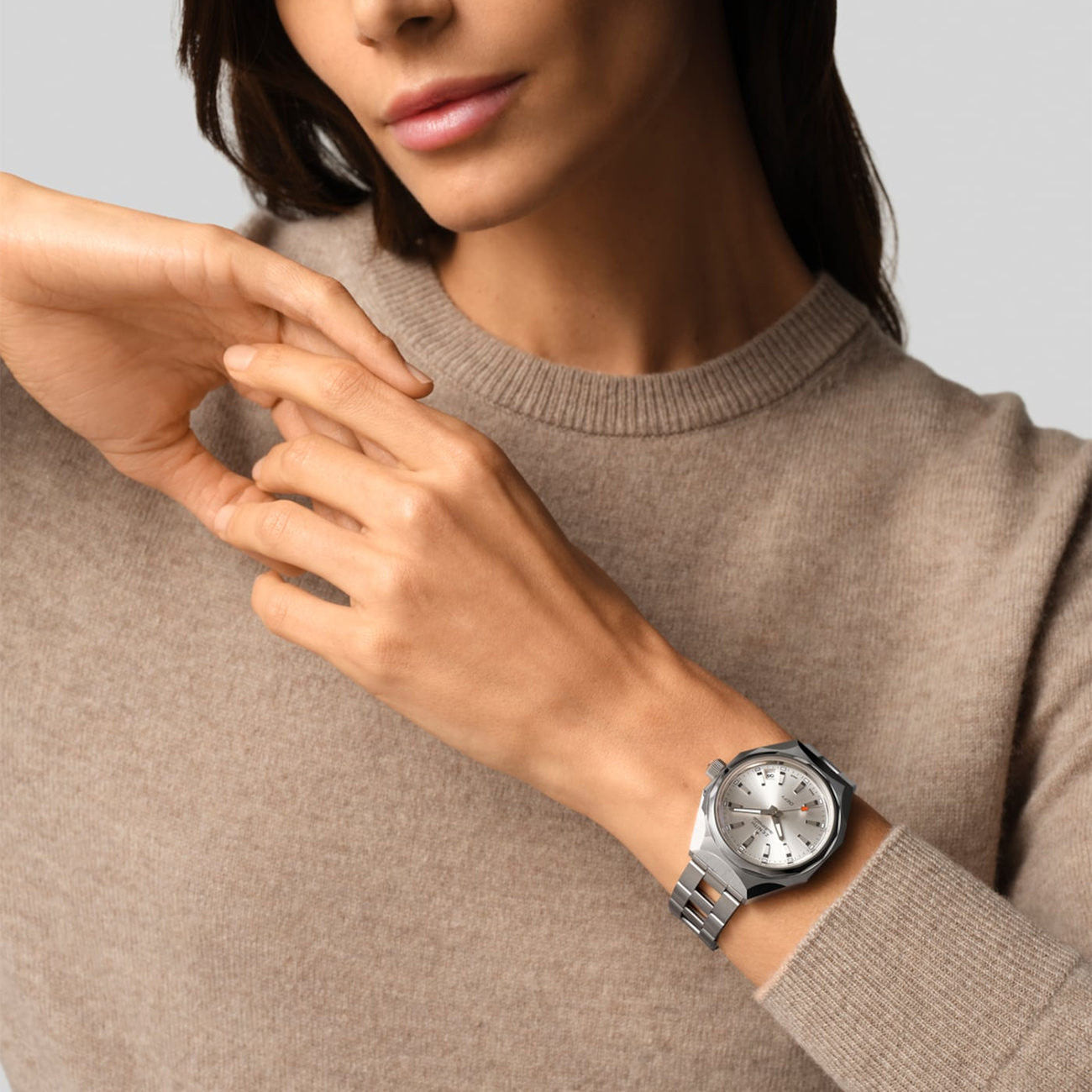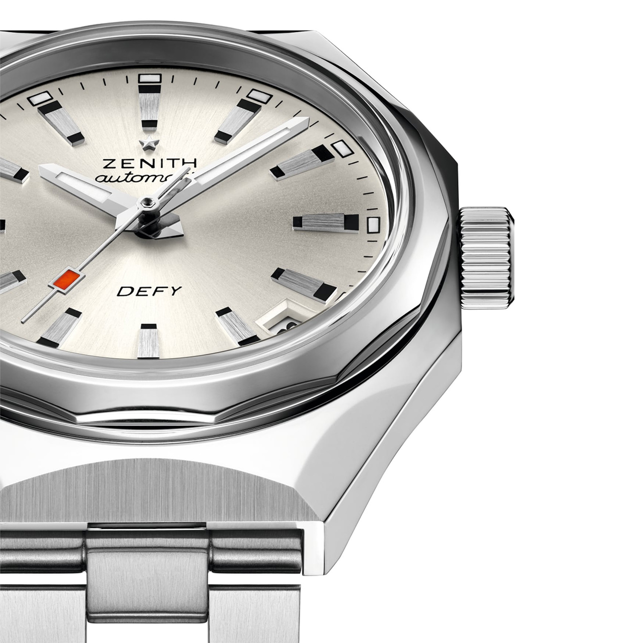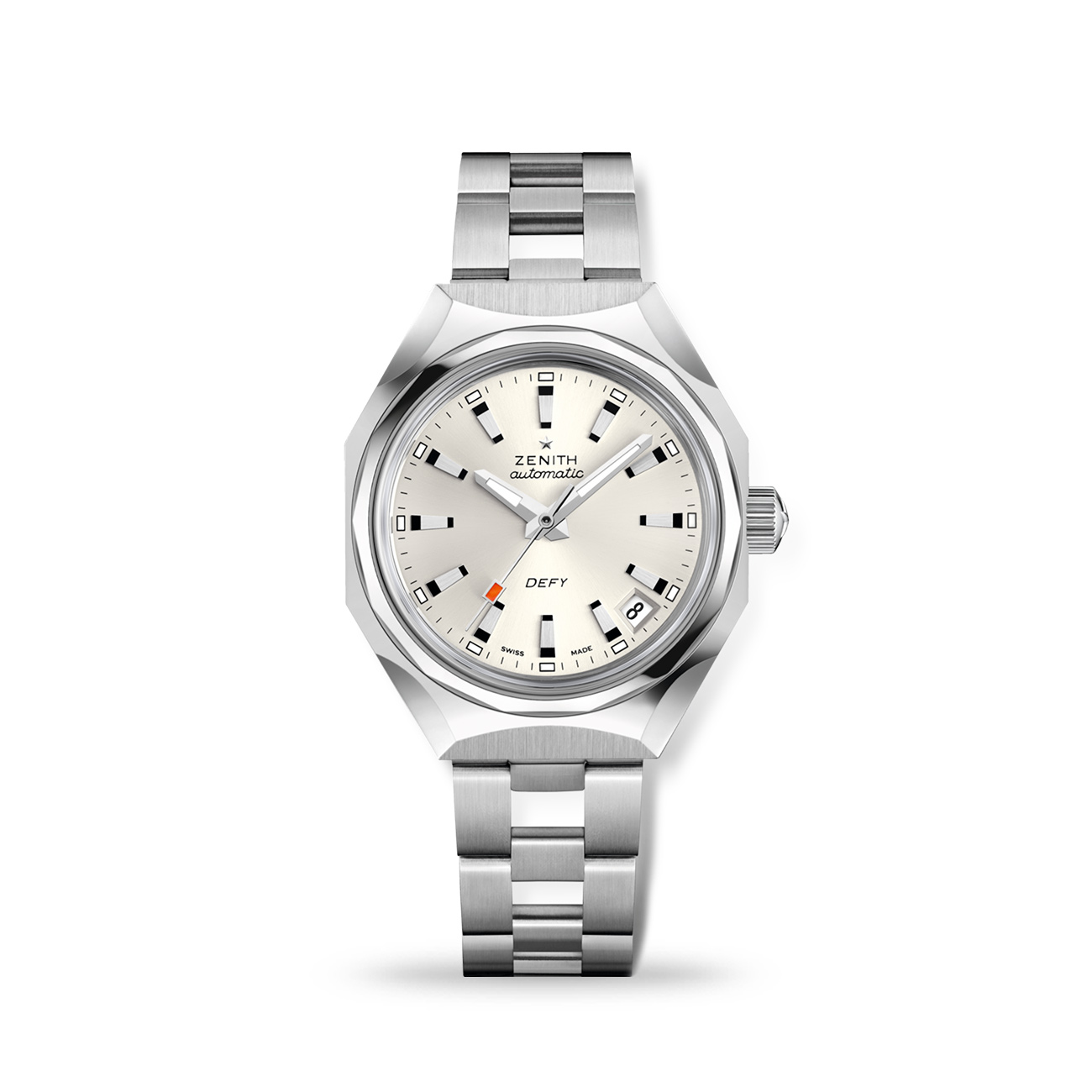 This Zenith Defy Revival 03-A3642-670/01.M3642 is a 37 mm stainless steel automatic timepiece inspired by Zenith’s iconic 1969 Defy design. Featuring a faceted octagonal case with a 14-sided bezel and a sunray silver dial with rhodium-plated hands and Super-LumiNova markers, it delivers clear timekeeping with central hours, minutes, seconds and a date at 4:30. Powered by the Elite 670 automatic calibre with a 50-hour power reserve and mounted on a signature steel ladder bracelet, it balances vintage style with modern performance.