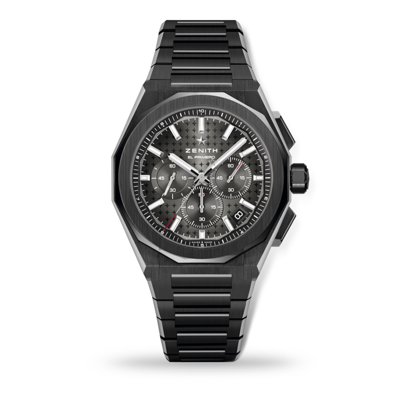 The DEFY Skyline Chronograph Ref. 49.9500.3600/21.I001 showcases cutting-edge precision in a bold 42mm black ceramic octagonal case with a faceted bezel. Its gradient anthracite sunray dial features ZENITH’s signature starry sky motif, powered by the El Primero 3600 automatic high-frequency chronograph. Operating at 5Hz, it delivers true 1/10th-of-a-second timing with a 60-hour power reserve, and includes an interchangeable black ceramic bracelet and rubber strap for versatile wear, that can easily be swapped thanks to our clever strap changing system.