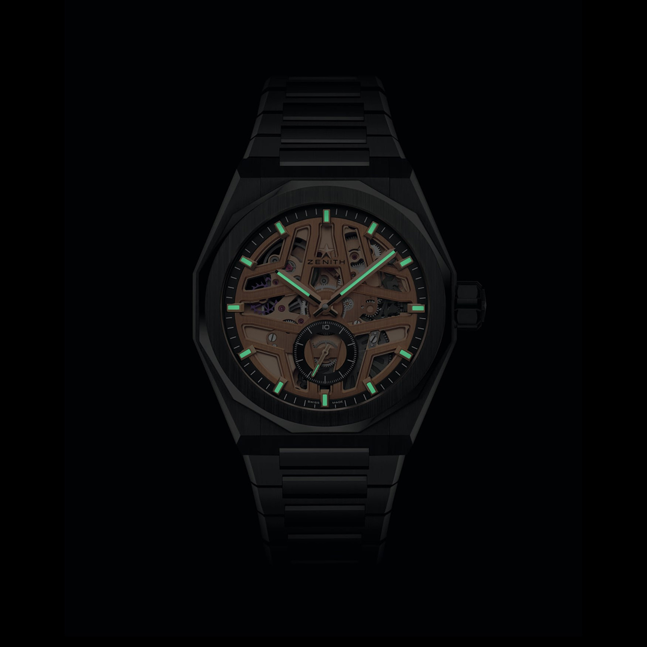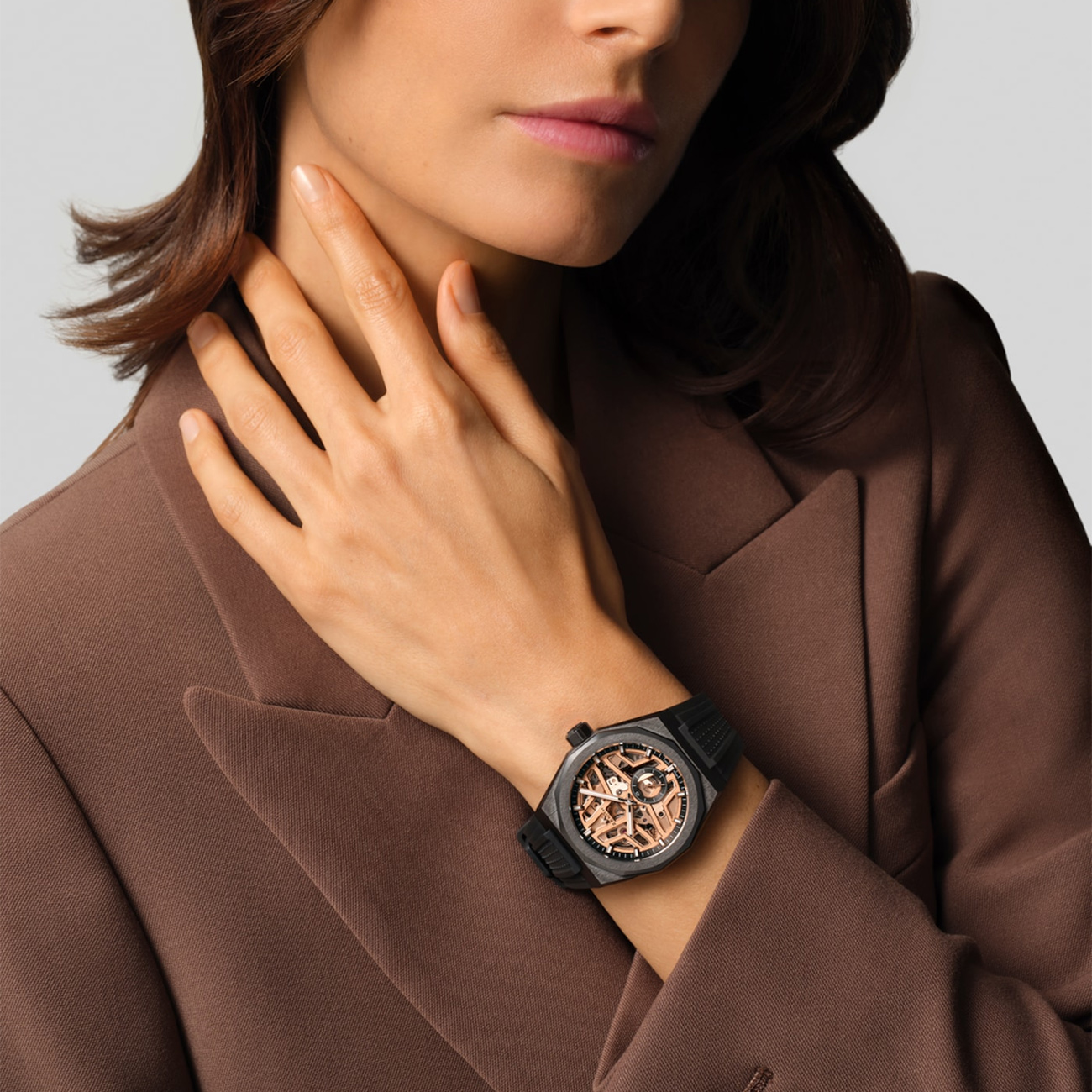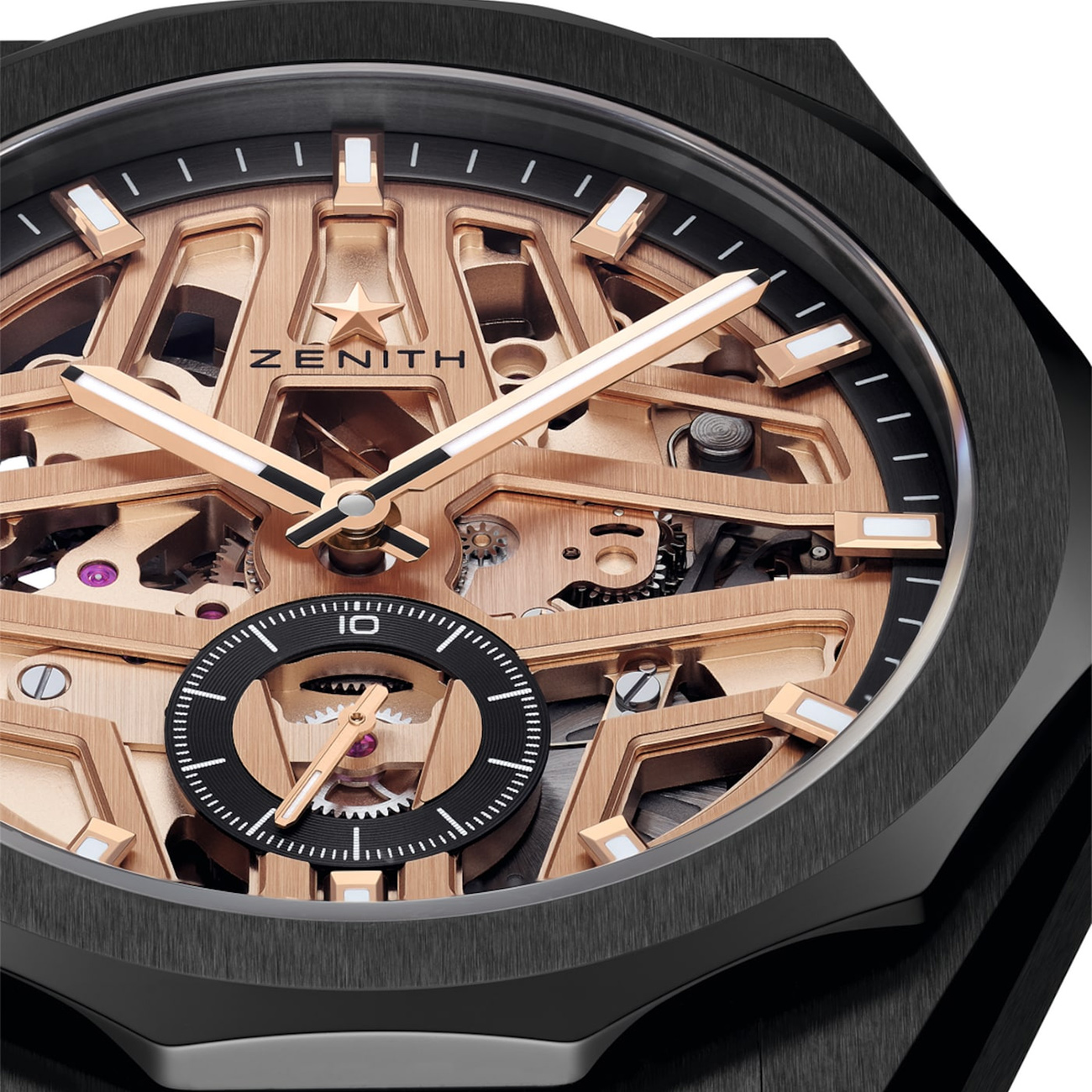 This Zenith Defy Skyline Skeleton 49.9300.3620/07.I001 is a striking 41 mm black ceramic automatic wristwatch featuring an openworked skeleton dial that showcases the high-frequency El Primero 3620 SK movement with its 1/10th-of-a-second indicator. The angular octagonal case and integrated black ceramic bracelet reflect the architectural modernity of the Defy Skyline line, while gold-toned faceted hands and Super-LumiNova markers ensure legibility. With an exhibition caseback, interchangeable rubber strap and 100 meters water resistance, it’s a bold fusion of engineering and design.